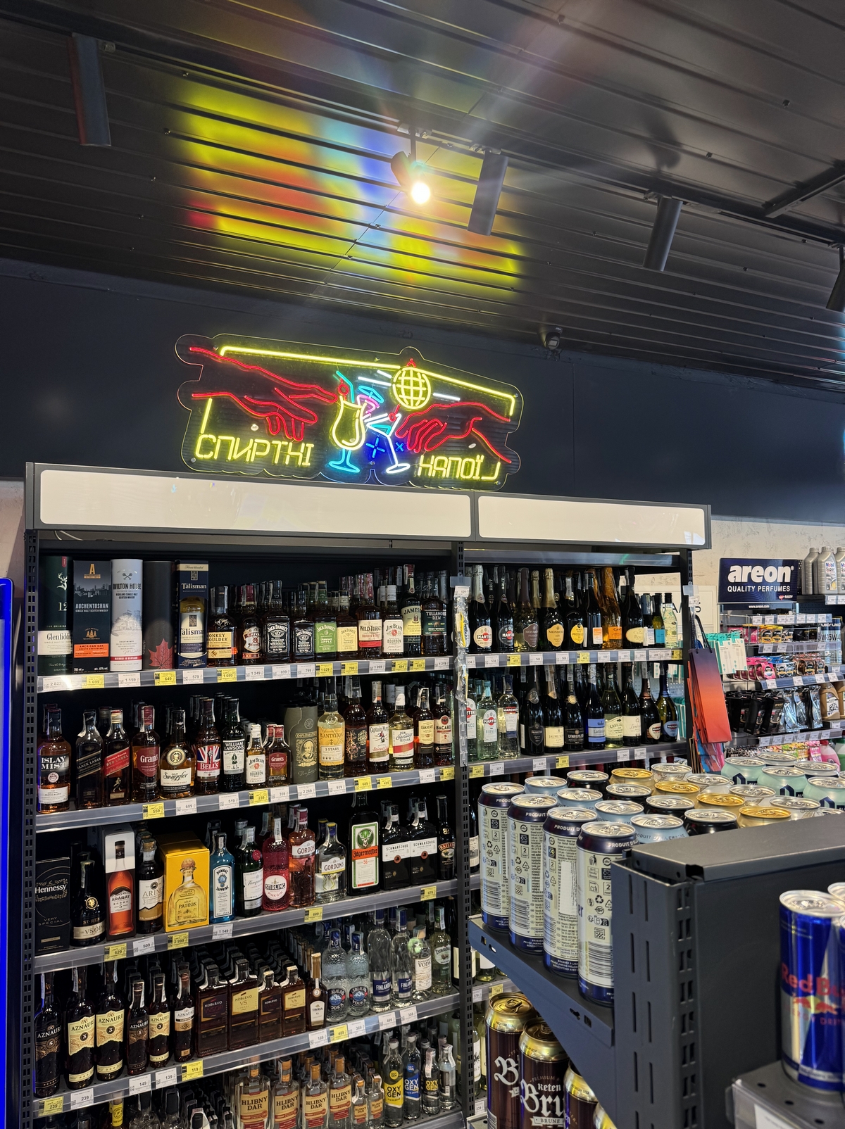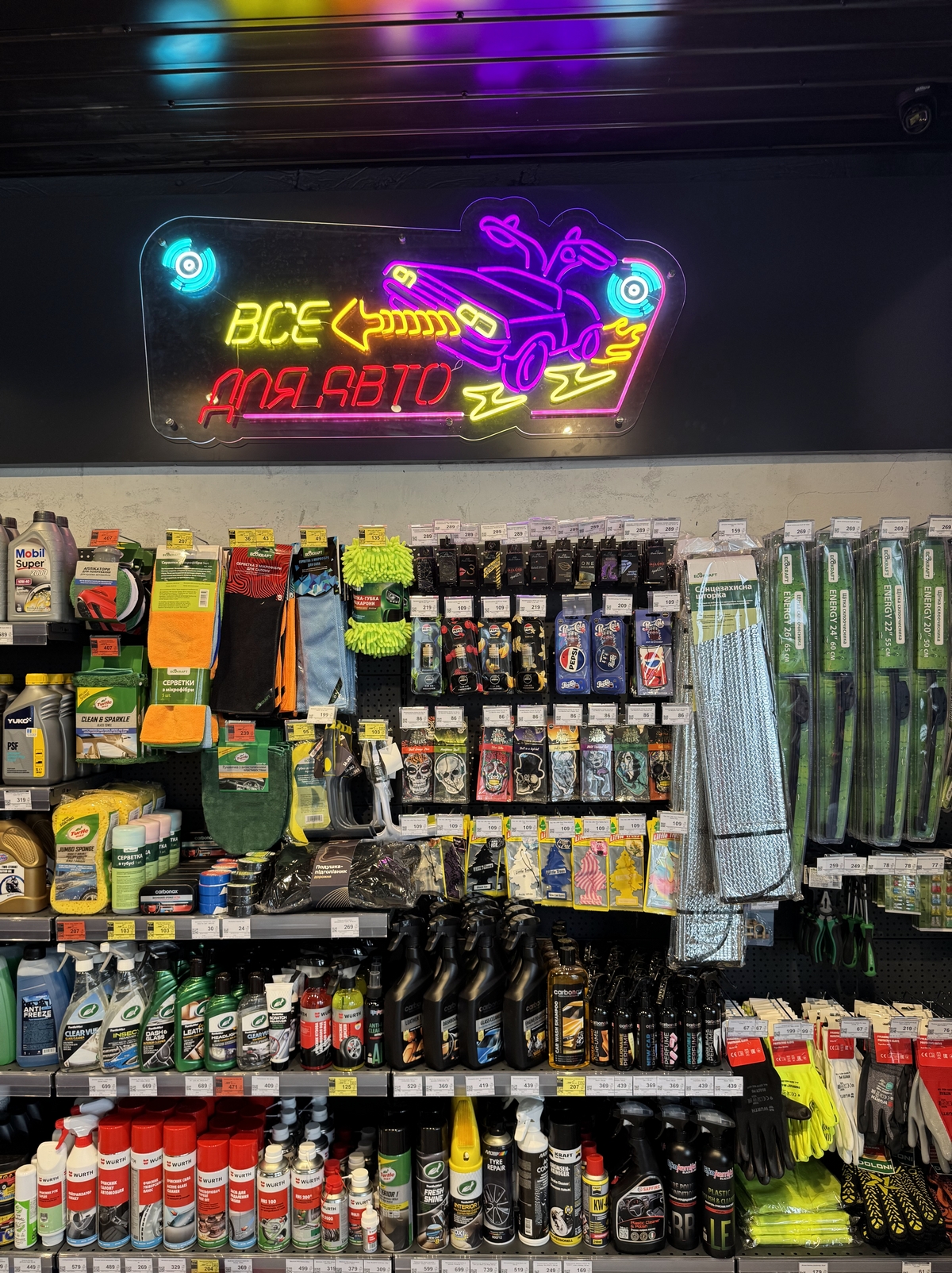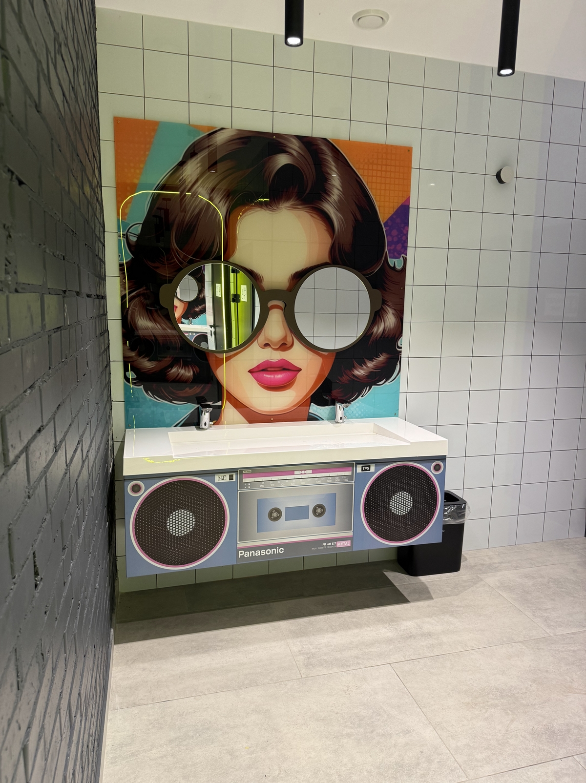 АЗК выполнена в диско-стиле: яркие неоновые цвета, декоративные элементы, отсылающие к эстетике 80–90-х, и световые акценты, создающие атмосферу вечеринки даже во время остановки на трассе. Таким образом продолжается традиция оформлять станции в тематическом стиле, даря гостям не только сервис, но и эмоции.