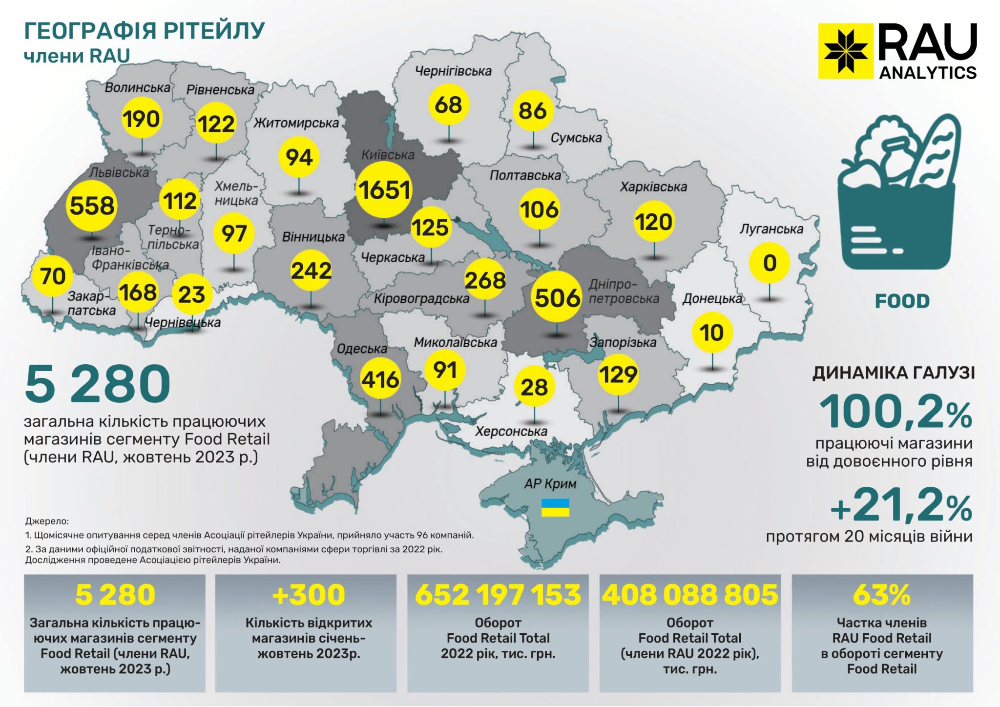Как показал регулярный ежемесячный опрос RAU, проведенный среди сотни членов Ассоциации ритейлеров, продовольственные магазины составляют наиболее существенную долю отечественного ритейла. Так, в октябре 2023 года на этот сегмент приходилось почти 30% или 5280 работающих магазинов. Только в 2023 году начали работать три сотни торговых точек: как новых, так и заново открытых. Всего за 20 месяцев войны отрасль возобновилась на 21,2%. Наибольшая концентрация продовольственного ритейла наблюдается в Киеве и области – 1651 торговая точка, что втрое превышает плотность покрытия еще двух регионов с максимальным количеством магазинов. Так, на втором месте по количеству магазинов находится Львовская область (558), а на третьем – Днепропетровская (506). В пятерку входят Одесская и Кировоградская области.