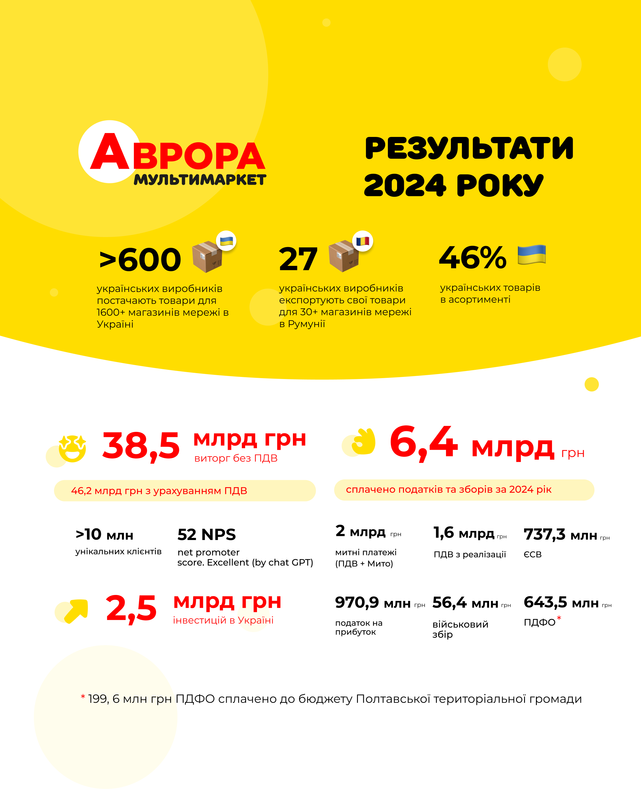 Выручка сети Аврора за 2024 год составила 38,5 млрд грн, из которых компания уплатила 6,4 млрд грн налогов и сборов. Среди местных бюджетов больше налогов за год традиционно получил бюджет Полтавы — 199,6 млн грн. Каждая уплаченная гривна — это помощь стране в такие сверхсложные времена.