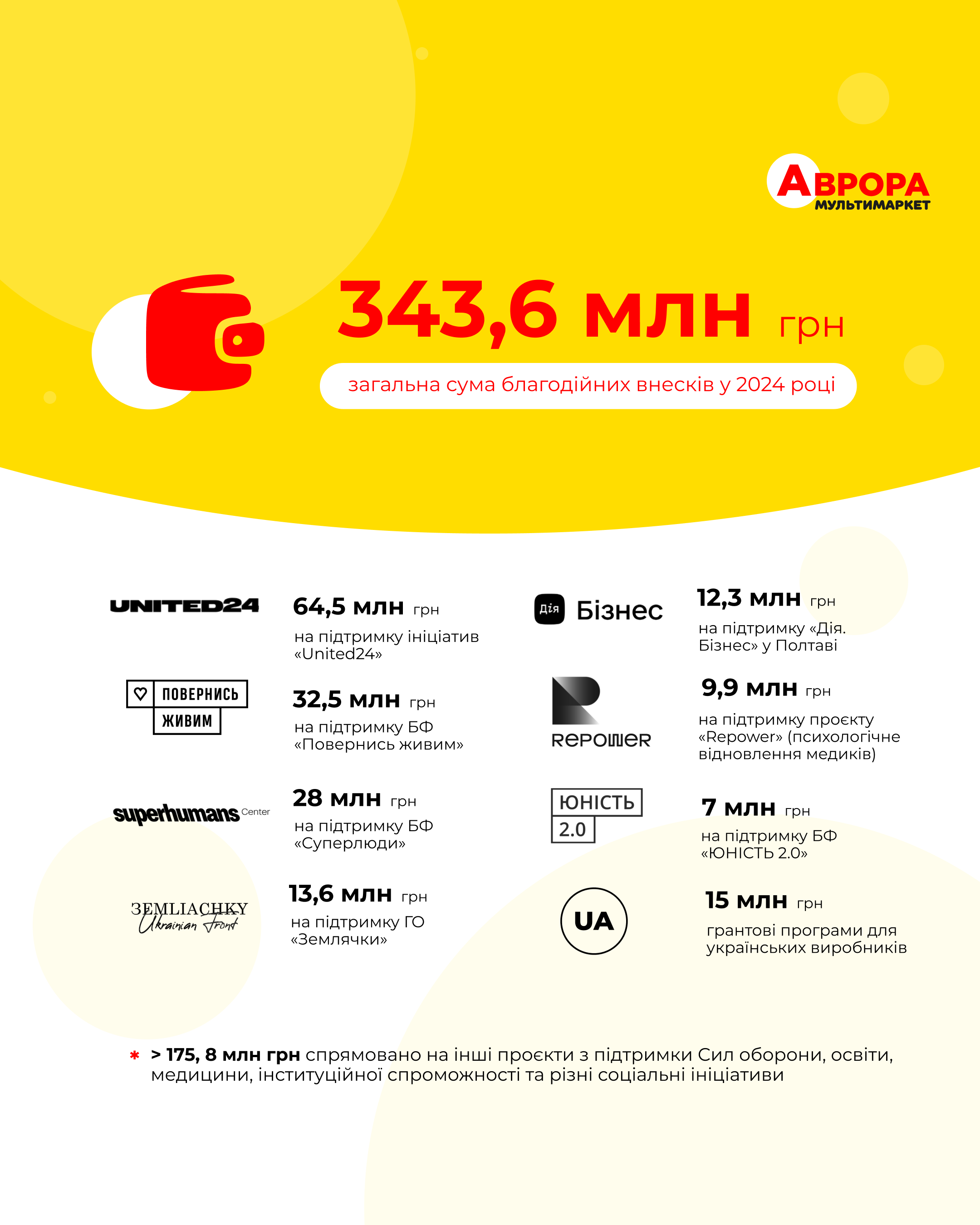 В прошлом году Аврора реализовала ряд масштабных инициатив, направленных на поддержку сил обороны и укрепление обороноспособности страны. В 2024 году компания передала на благотворительность 343,6 млн гривен. В частности, в поддержку “Повернись живим”, “Землячки”, на реабилитацию в Superhumans, на проект по психологическому восстановлению медиков Repower, в поддержку Дія Бізнес Полтава и поддержала многие другие важные инициативы.