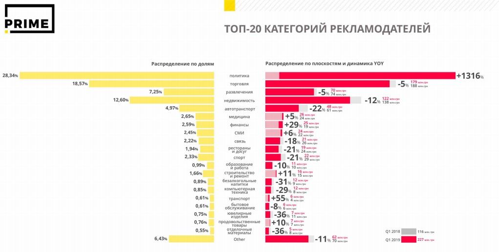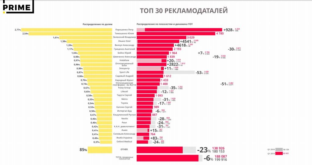 Из 30-ти крупнейших рекламодателей Украины за первый квартал 2019 года большая половина — политические партии и экс-кандидаты в президенты страны. Сфера торговли в топ-30 представлена компаниями Эпицентр, Fozzy Group, Metro и Ашан.