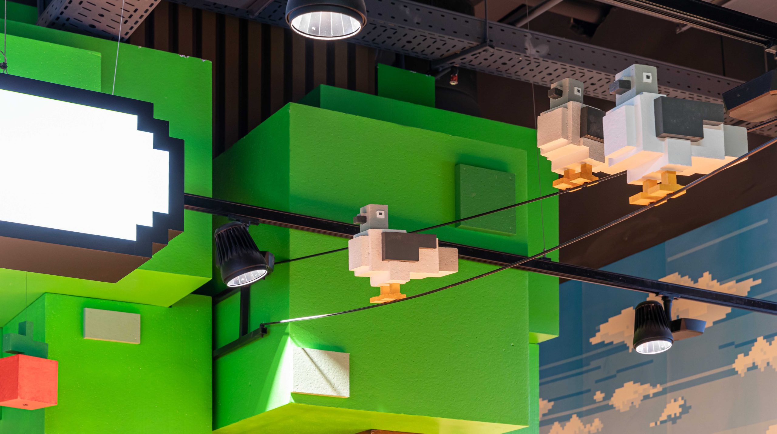Над всем этим несется гоночная трасса. Среди фаворитов пиксельных гонки ― барашек на скейте, курочка Лавки традиций на тракторе, курьер-вкусовсадник на скутере и грузовики собственной кондитерской. Впрочем, это соревнование не на скорость, а на качество. Такую же философию предлагают и гостям.