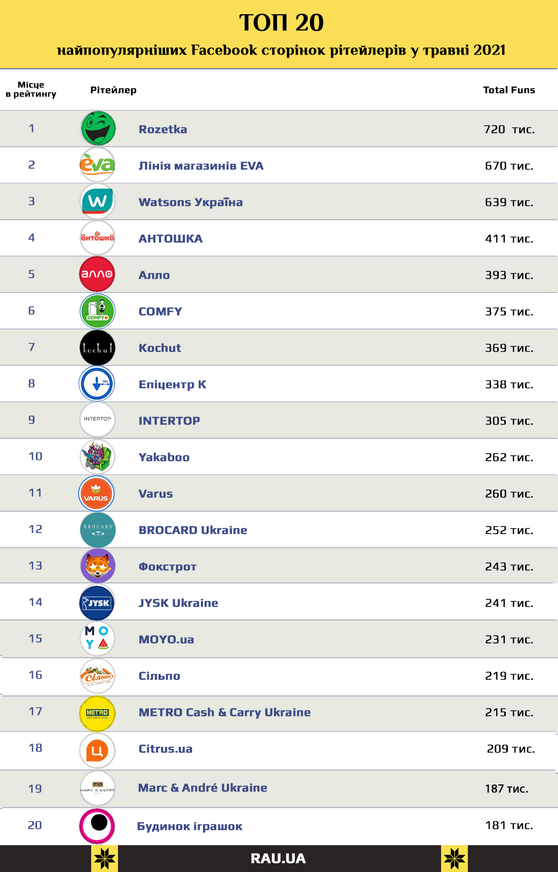Представляем рейтинг ритейлеров, которые собрали наибольшее количество поклонников в самых популярных соцсетях мира. RAU анализировала страницы методом выборки наиболее крупных и известных розничных игроков и объектов коммерческой недвижимости, а также тех, кто представлен в рейтинге Facebook согласно аналитического сервиса Socialbakers. Если по каким-то причинам ваша страница не попала в финальный топ, пишите нам на e-mail – news@rau.ua.