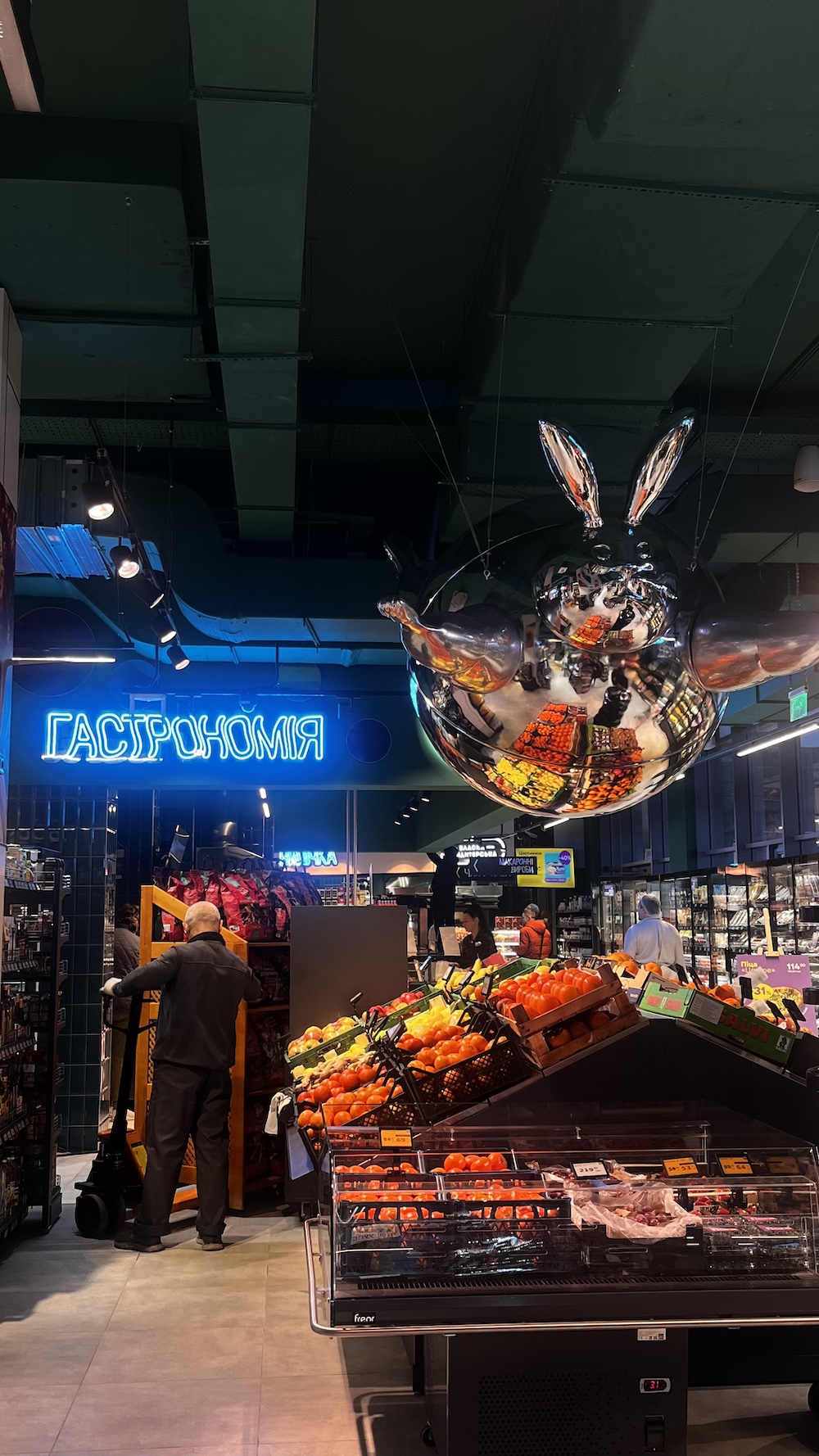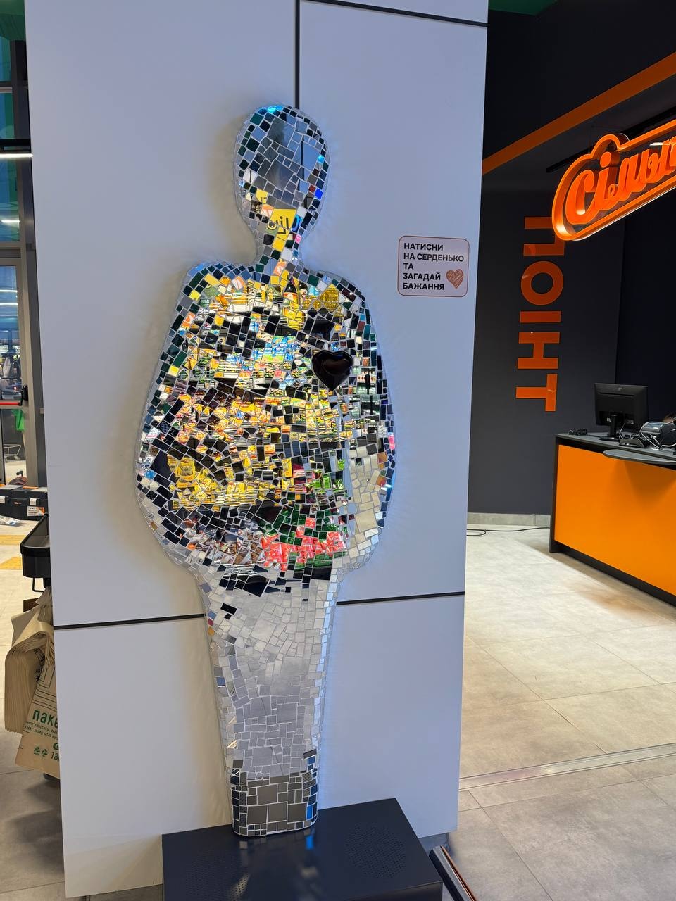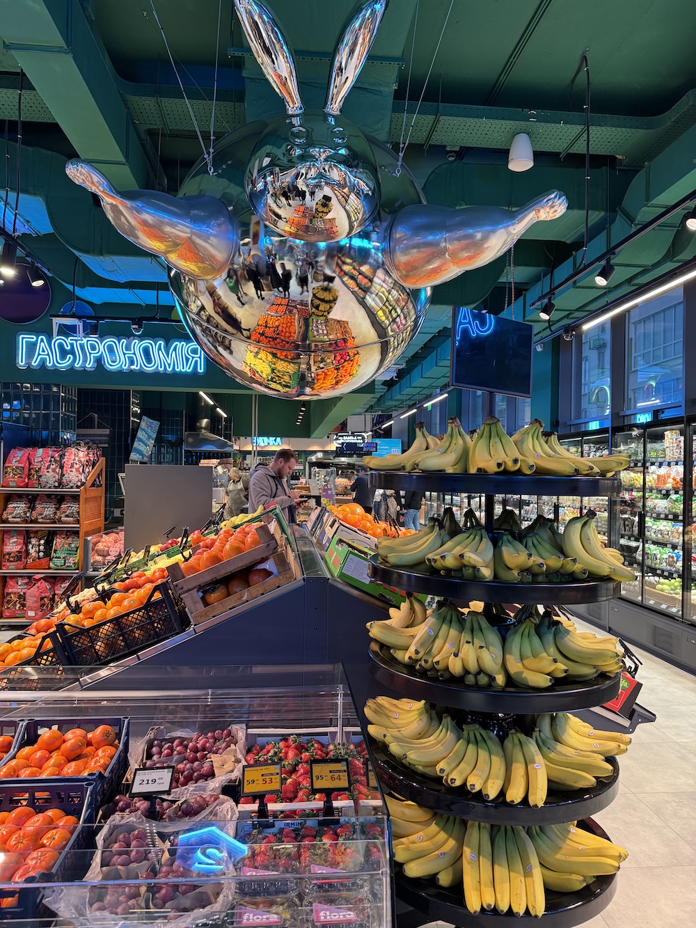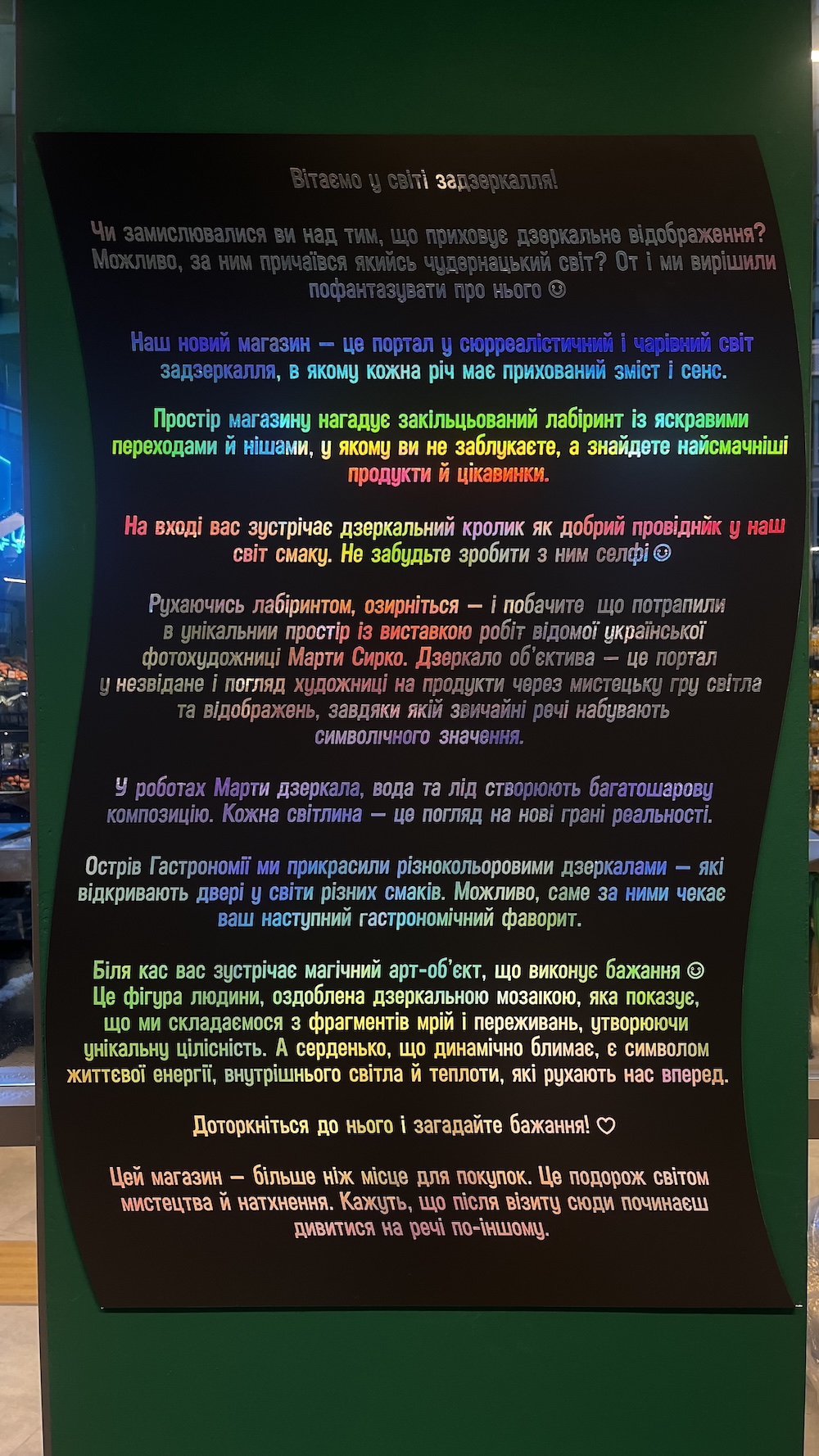 При входе гостей встречает артинсталляция в виде человека из зеркальной мозаики, сердце которого пульсирует светом, напоминая о силе жизненной энергии. В глубине магазина – зеркальный кролик, который будто приглашает на прогулку в «Страну чудес». А зона гастрономии украшена зеркальными окошками, которые создают иллюзию входа в параллельные миры.