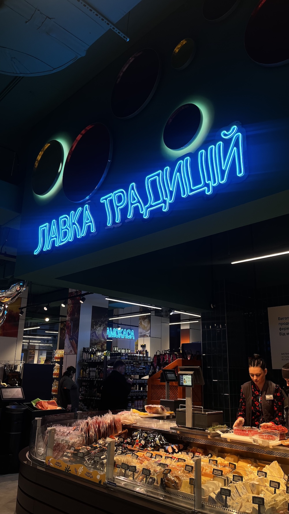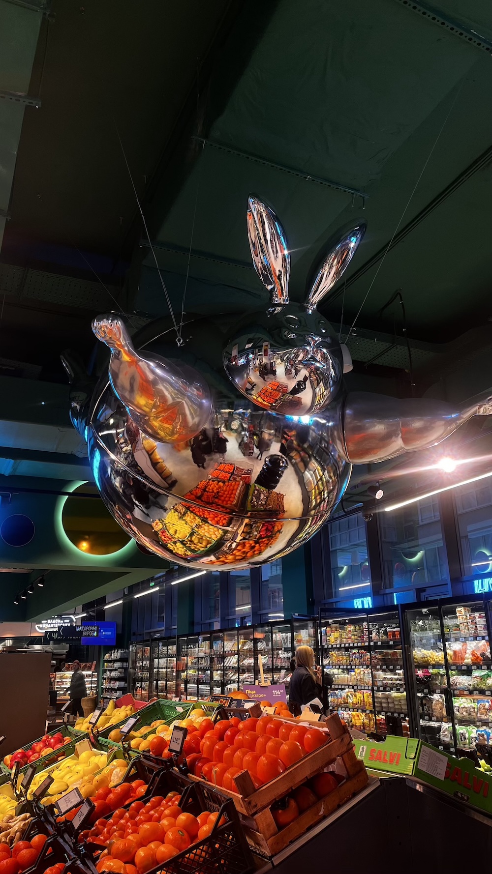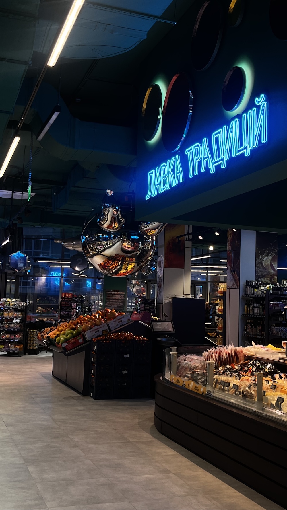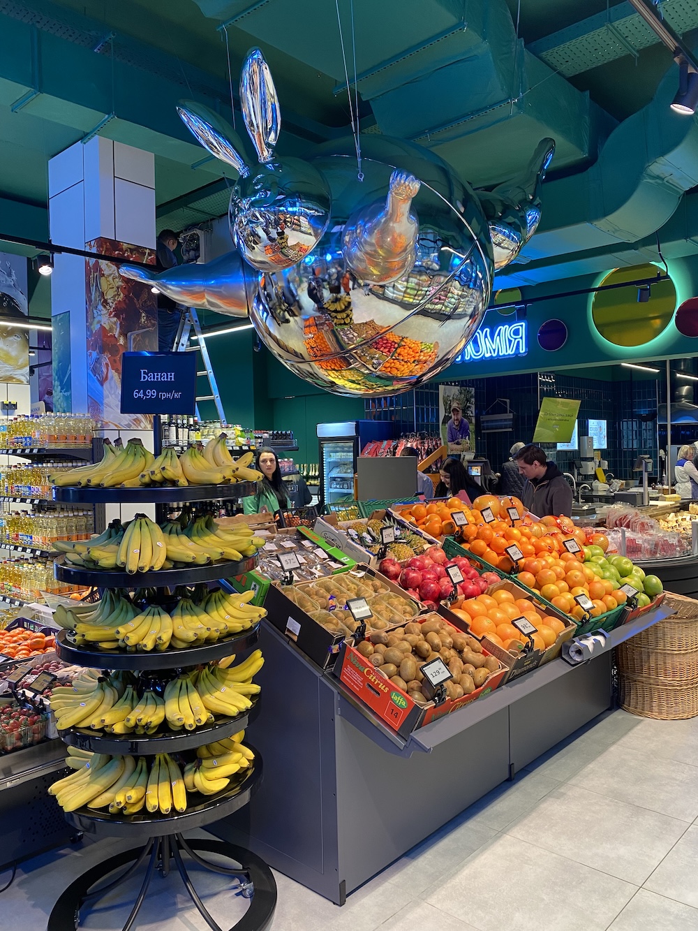 При входе гостей встречает артинсталляция в виде человека из зеркальной мозаики, сердце которого пульсирует светом, напоминая о силе жизненной энергии. В глубине магазина – зеркальный кролик, который будто приглашает на прогулку в «Страну чудес». А зона гастрономии украшена зеркальными окошками, которые создают иллюзию входа в параллельные миры.