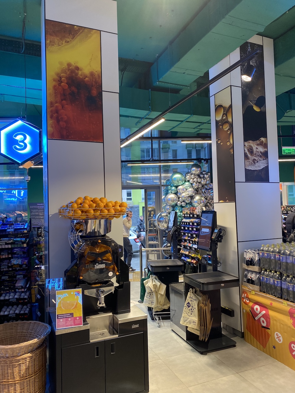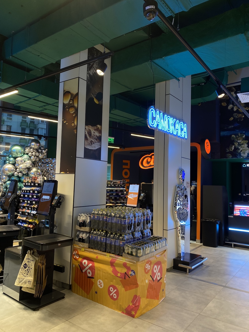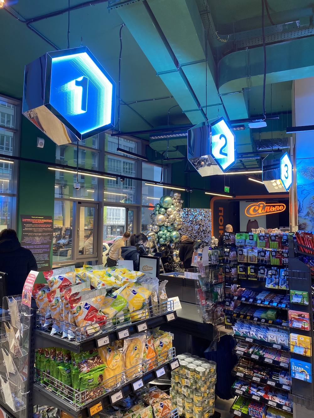 Площадь торгового зала магазина 565 кв. м. В супермаркете работает три обычные кассы и пять самокасс.