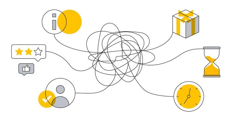 Стилизованная иллюстрация, шесть закрученных линий, создающих хаос, который символизирует сложность принятия решений о покупке. Каждая линия начинается со значка, соответствующего одной из шести поведенческих установок: влияние социальных сетей, авторитет, правила принятия решений, бесплатные предложения, проблема дефицита, желание жить здесь и сейчас.