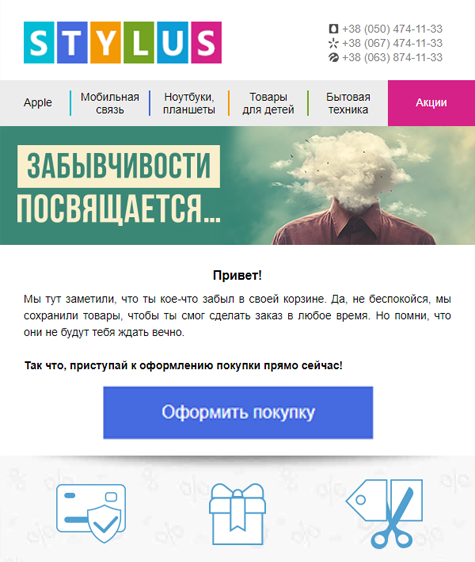 Как и многие другие интернет-магазины, Stylus.ua использует триггеры, позволяющие вернуть на сайт не завершившего заказ клиента. Изначально такие рассылки состояли всего из одного письма: