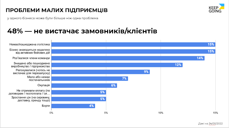Среди основных проблем кроме поиска новых клиентов — поврежденная логистика, близость боевых действий, потеря команды, уничтожение или повреждение предприятия. Больше всего нуждаются в помощи сейчас в Киевской, Харьковской, Одесской, Днепропетровской и Донецкой областях.