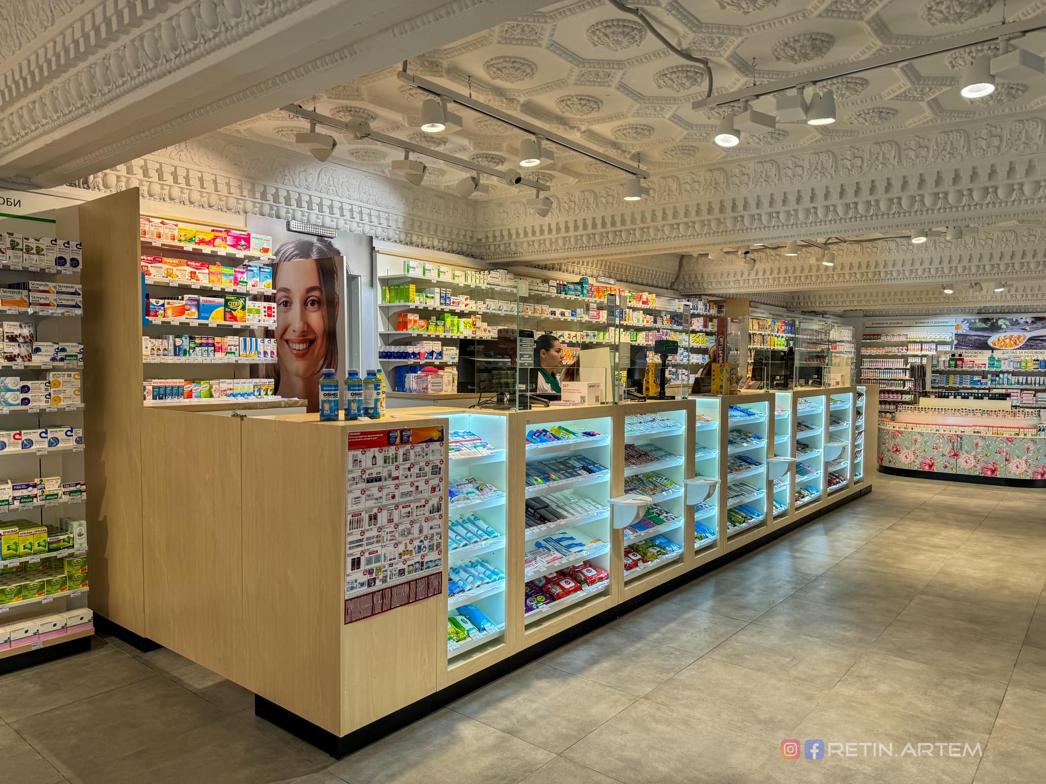 Главной задачей при создании проекта магазина было найти сбалансированное решение между дизайном, удобством для покупателя и комфортом для персонала. В таких технически сложных проектах довольно сложно с первого раза угадать с ассортиментом и заранее проработать все нюансы. Многие процессы команда, вместе с владельцами сети, оттачивает уже в процессе, лично тестируя сервисы и удобство конструктива аптеки для посетителей.