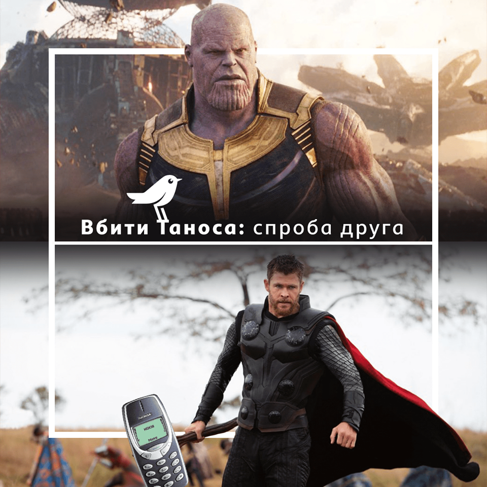 Ярко хайпанули на очередных “Мстителях” в Ашан. Для победы над суперздодеем предложили вместо молота Тора использовать что-то потяжелее – например телефон Nokia.