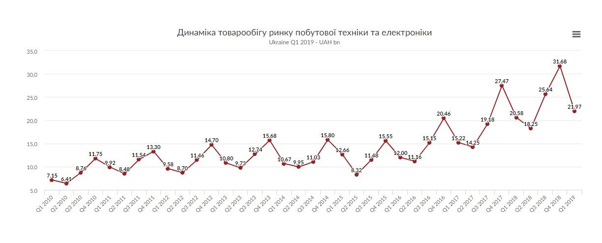 Общий объем украинского рынка бытовой техники и электроники в первые три месяца 2019 года составил почти 22 млрд грн.