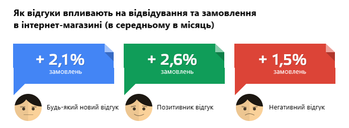 Не менее масштабное исследование активности посетителей и покупателей провел маркетплейс Prom.ua – аналитики проанализировали 1,5 млн заказов в 8500 интернет-магазинах разных отраслей. Увеличение посещаемости оказалось и при отрицательных, и при положительных отзывах. Как известно, многие покупатели вводят в поисковики название товара или сайта сразу со словом «отзывы», поэтому наличие отзывов нередко повышает позицию сайта в поисковой выдаче.