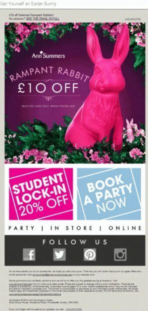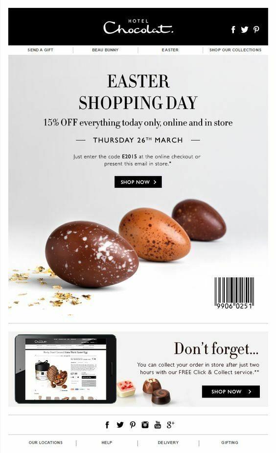 По сути, это идеальное предпасхальное письмо. Оно содержит яркий праздничный акцент (шоколадные яйца), понятное коммерческое предложение (скидка 15%), призыв к действию (SHOP NOW – купить сейчас) и контакты магазина. Это идеальная формула добротного классического праздничного письма. Если в спешке на креатив не хватает сил – смело используйте эту формулу. Она проверенная и конверсионная.