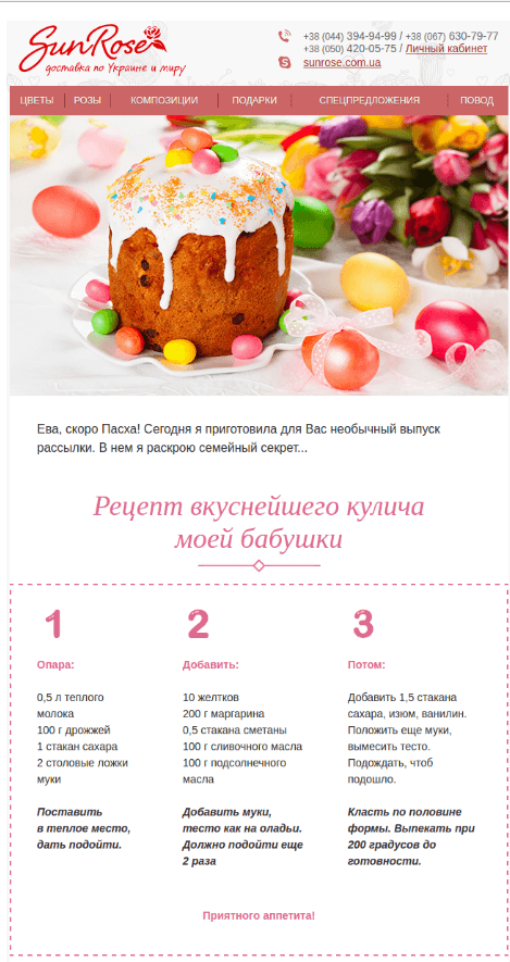 Предпасхальное сообщение несет полезную и применимую на практике информацию. Это не продажная рассылка: здесь нет call-to-action или зазывающих алых скидок. Это пример стратегического e-mail-маркетинга, рассчитанного на увеличение лояльности клиента.