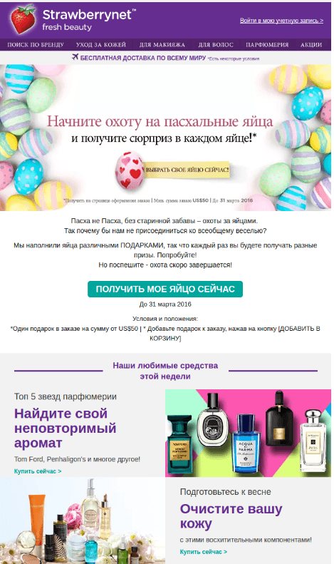 По словам маркетологов, продажи повысили не столько креативный дизайн и четкий план рассылок, сколько сверхпредложение: через сообщения клиенты получали больше, нежели скидку. Как это воплотить в жизнь – ярко показывает праздничная рассылка от интернет-магазина косметики Strawberrynet: