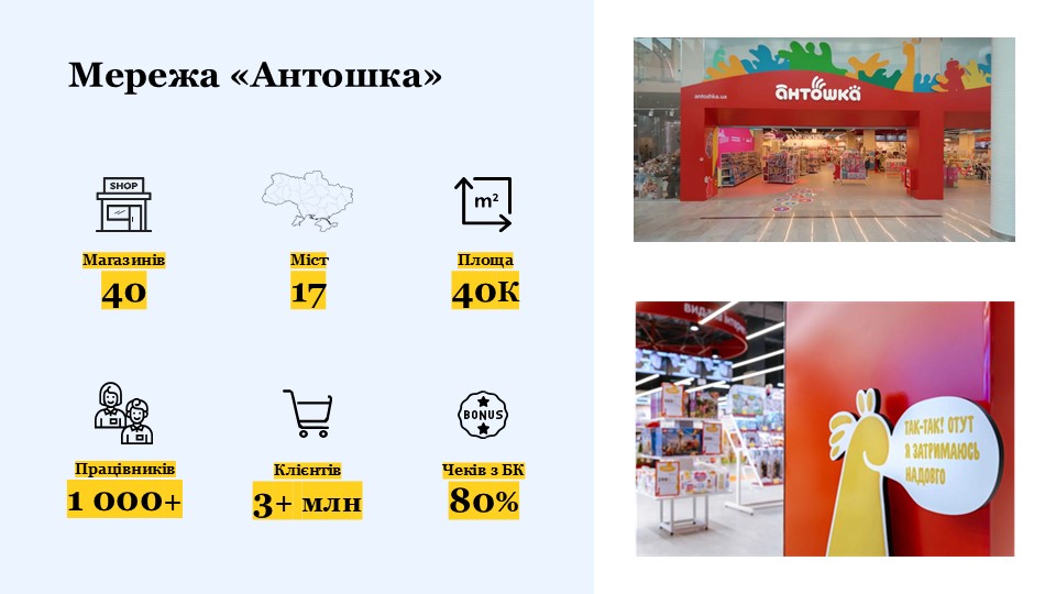 В настоящее время сеть Антошка насчитывает 40 магазинов в 17 городах Украины общей площадью 40 000 кв. м. В компании работают более 1000 сотрудников, 75% из которых – это персонал розничных точек. В год обслуживают более 3 млн клиентов, а 80% чеков выдают с использованием бонусных карт.