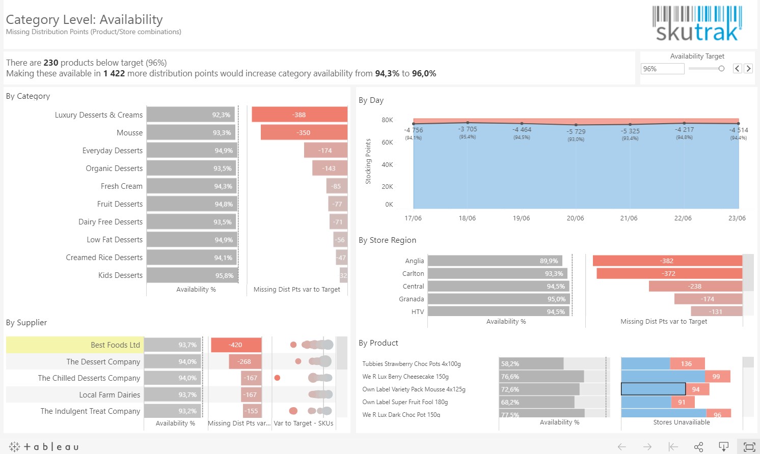 Дашборди будуть корисні представникам роздрібної торгівлі для обробки даних про складські запаси чи наявність товару на полицях магазинів. Без проблем не тільки аналізувати ланцюжок поставок, але і за потреби, що важливо, оптимізувати його. Демонстрація наявності товарно-матеріальних запасів і забезпечення узгодженості дій роздрібних продавців, постачальників і складів дозволяє визначити потрібну кількість запасів у конкретних магазинах відповідно до побажань покупців, їхніх переваг і трафіку.