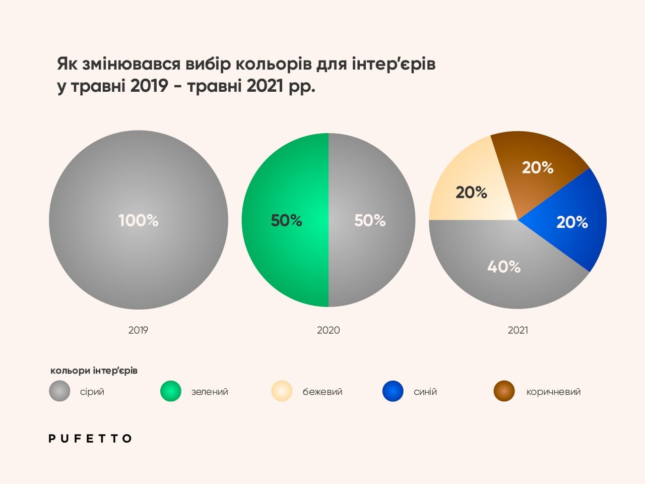 Это заметно и в цветах отделки интерьеров. От доминантного серого в 2019 году предпочтения аудитории перешли к умеренному разнообразию – с вкраплениями зеленого в 2020 году, бежевого, коричневого, синего в 2021 году. Преобладают спокойные оттенки, без ярких красок.