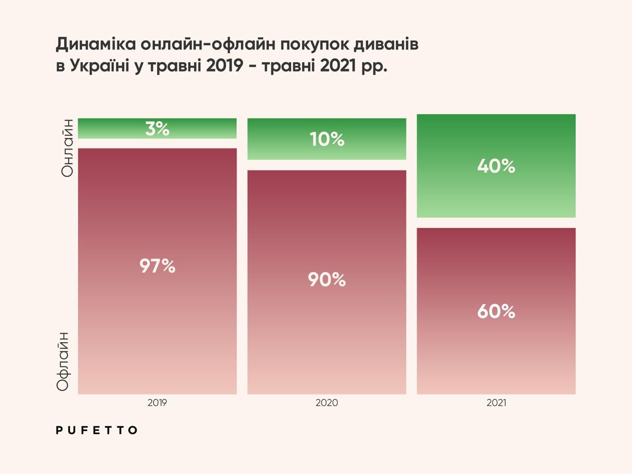 Чтобы выяснить, как изменилась динамика офлайн и онлайн продаж мебели в Украине с начала коронакризиса, Pufetto провел исследование, проанализировав статистику через внутреннюю CRM-систему. По данным компании, в 2021 году люди уже настолько освоились в формате онлайн покупок, что покупали в 1,5 раза больше, не заботясь возможными рисками.