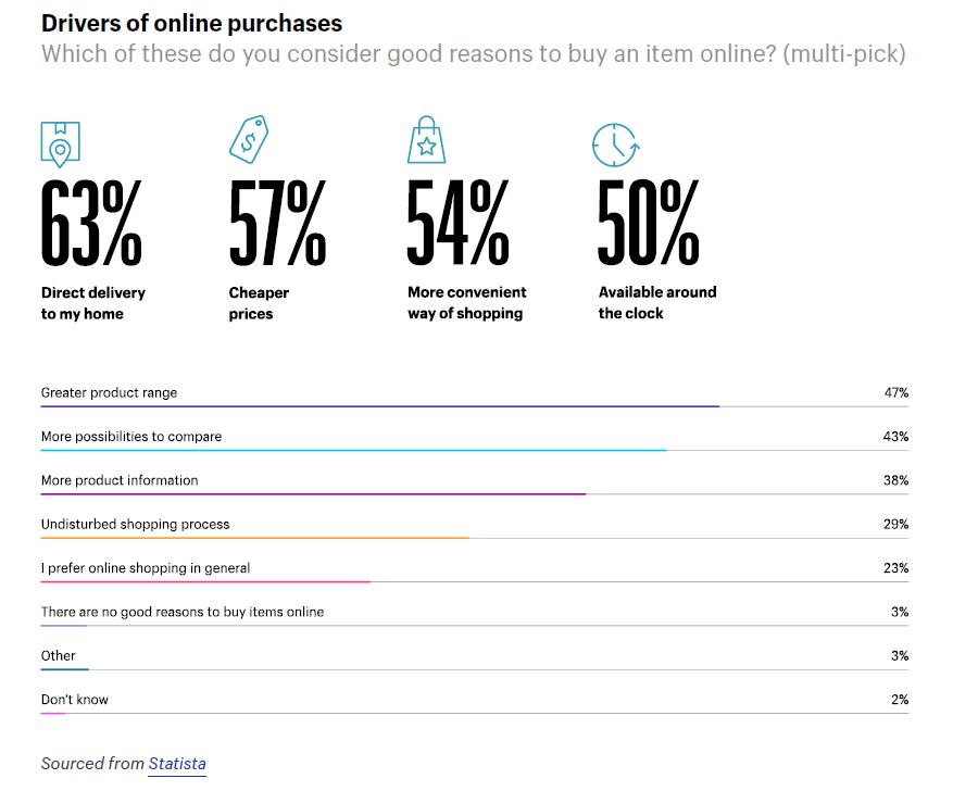 Пандемия также усилила растущее стремление потребителей к удобству, быстроте и простоте. Так, 64% потребителей считают веской причиной купить товар в интернете, если будет прямая доставка на дом, а 57% – если будет более низкая цена. Для половины респондентов оказались также важны более удобный способ покупки (54%), круглосуточная доступность (50%) и больший ассортимент для выбора (47%).