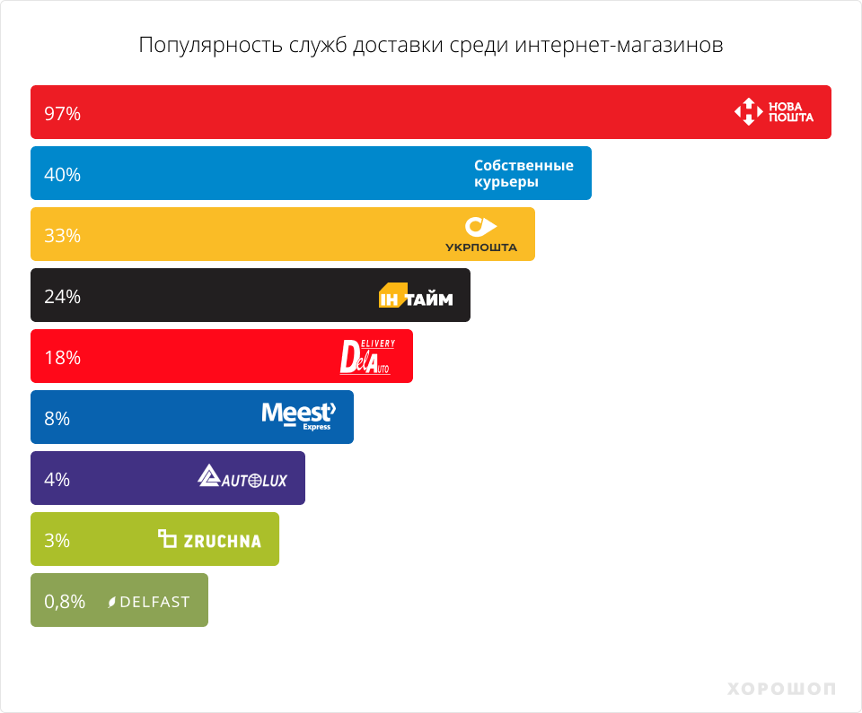 Служба доставки Нова пошта ожидаемо оказалась самой популярной. Ею пользуются 97% опрошенных, что почти втрое больше, чем результат ее ближайшего конкурента – Укрпошта (33%). Наименее популярными оказались Zruchna (3%) и Делфаст (0,8%).