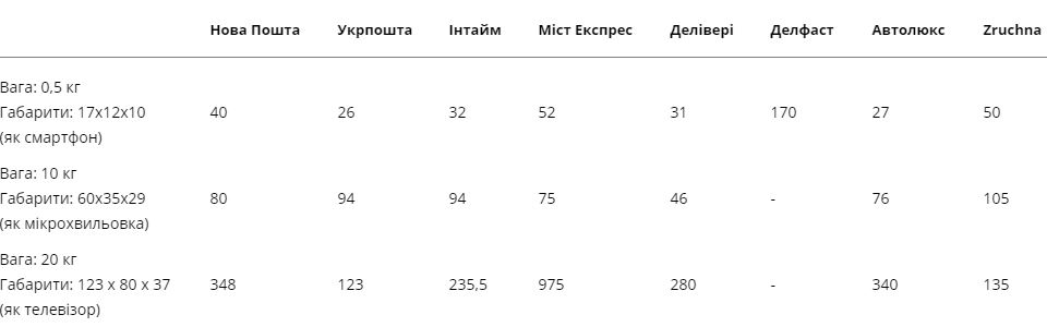 Оказалось, что небольшие грузы дешевле перевозить службами Укрпошта (26 грн) и Автолюкс (27 грн). Средние – Delivery (46 грн) и Meest Express (75 грн). А для больших дешевле использовать Zruchna (135 грн) и Укрпошта (123 грн).