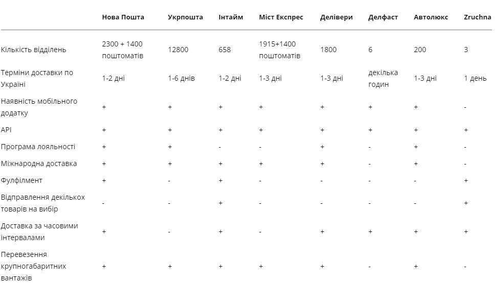Крупнейшие сети отделений – у Укрпошта (12800) и Нова пошта (2300 + 1400 почтоматов). В конце рейтинга – служба Делфаст, которая может похвастаться лишь шестью отделениями, и Zruchna, у которой их всего три. Делфаст и Zruchna занимаются адресной доставкой, поэтому им не нужно много отделений. И скорость доставки товаров у них намного выше, чем у других служб (Делфаст доставляет посылки по Киеву на электровелосипедах, а Zruchna доставляет заказы по Киеву, Харькову и Днепру, а также между этими городами). Дольше всех везет посылки Укрпошта – 4-6 дней, хотя у нее есть экспресс-доставка, которая может справиться за 1-2 дня.