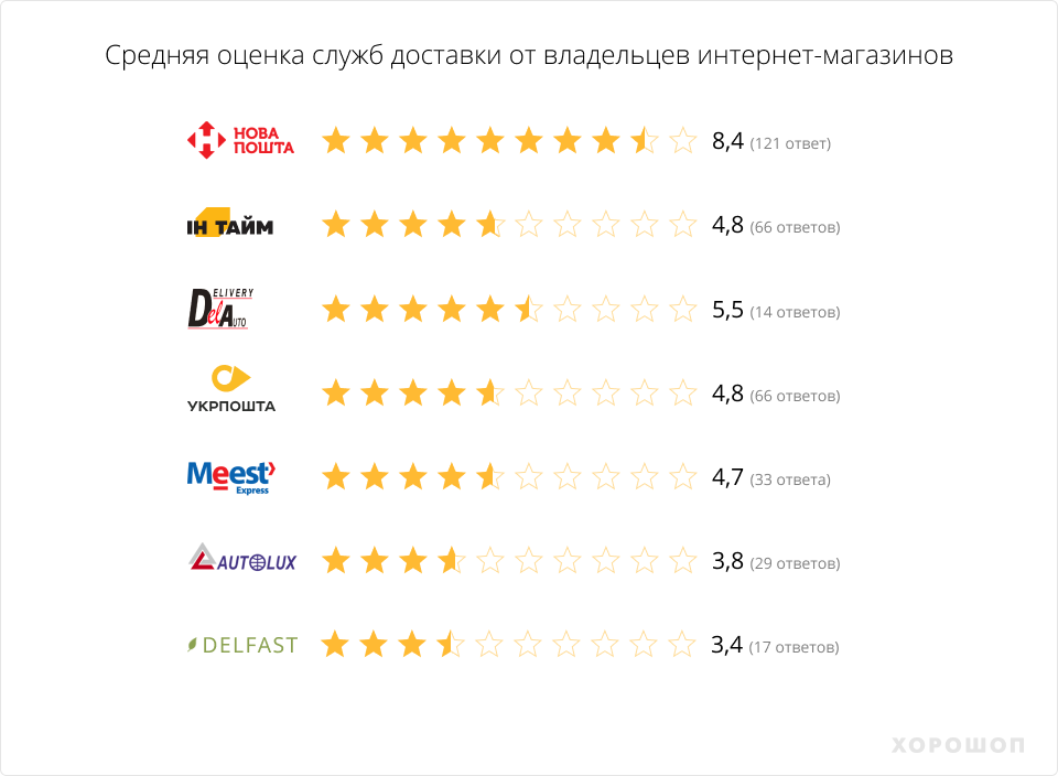 На украинском рынке представлено много служб доставки, и чтобы выяснить, чем они отличаются, сервис horoshop.ua, провел опрос среди интернет-магазинов. Платформа разослала интернет-магазинам анкету, в которой попросили указать: какими службами доставки они пользуются, и в каких объемах. А также оценить компании по десятибалльной шкале.