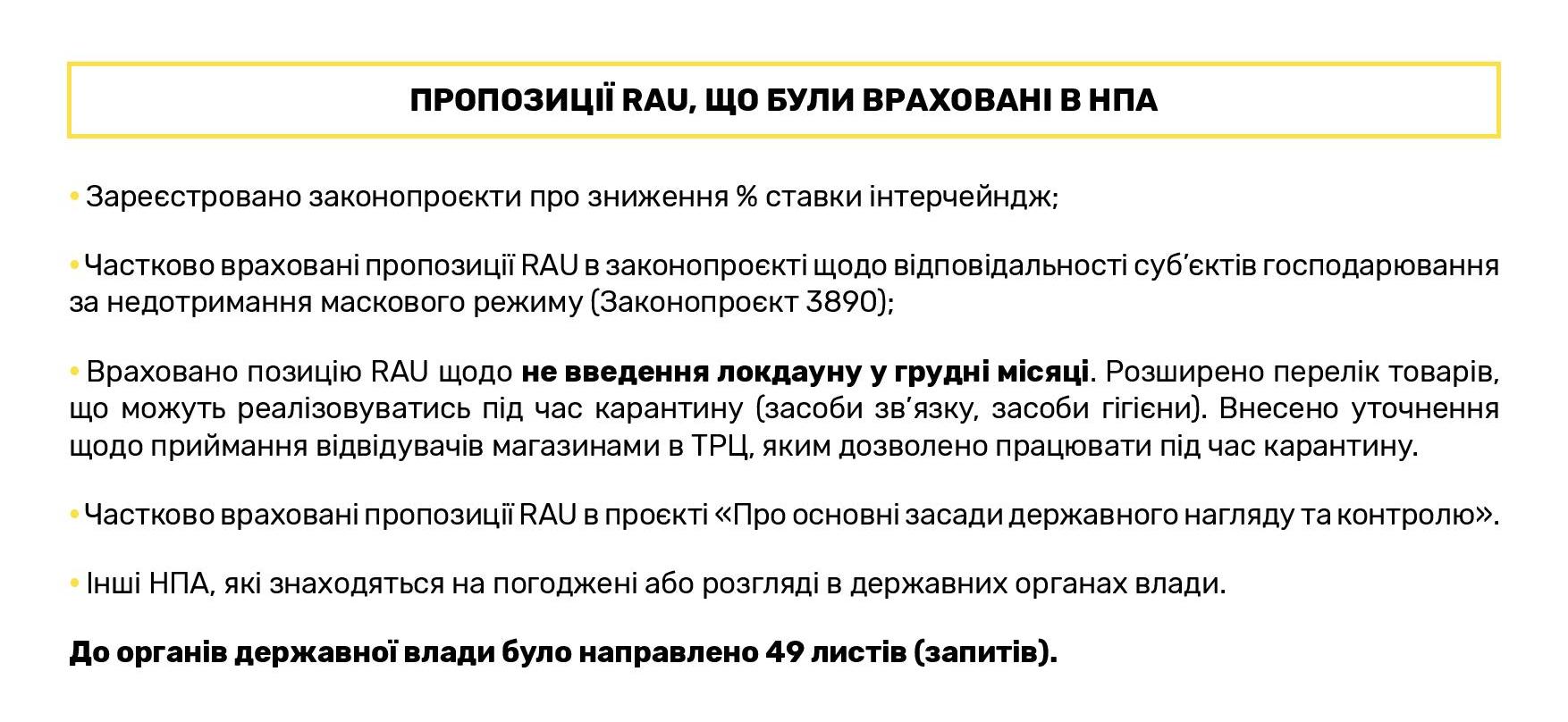 В целом за прошлый год Ассоциация ритейлеров Украины провела 15 RAU Webinars и 3 офлайн-воркшопа, а также три масштабных мероприятия сферы ритейла и девелопмента: церемонию награждения лучших компаний отрасли RAU Awards 2020, крупнейшую в Украине профильную выставку RAU Expo и традиционный итоговый RAU Summit (в формате онлайн ритейл-шоу).