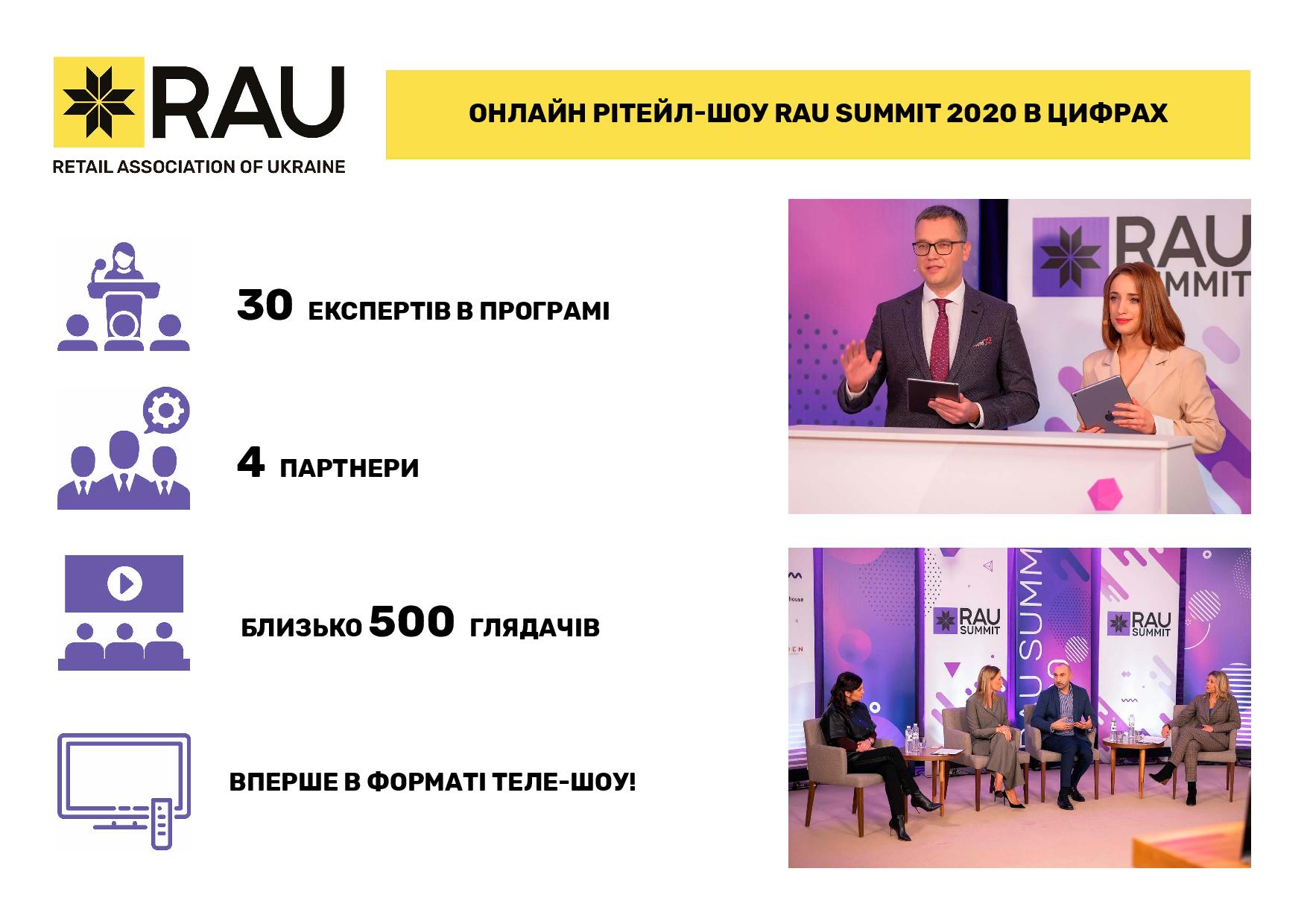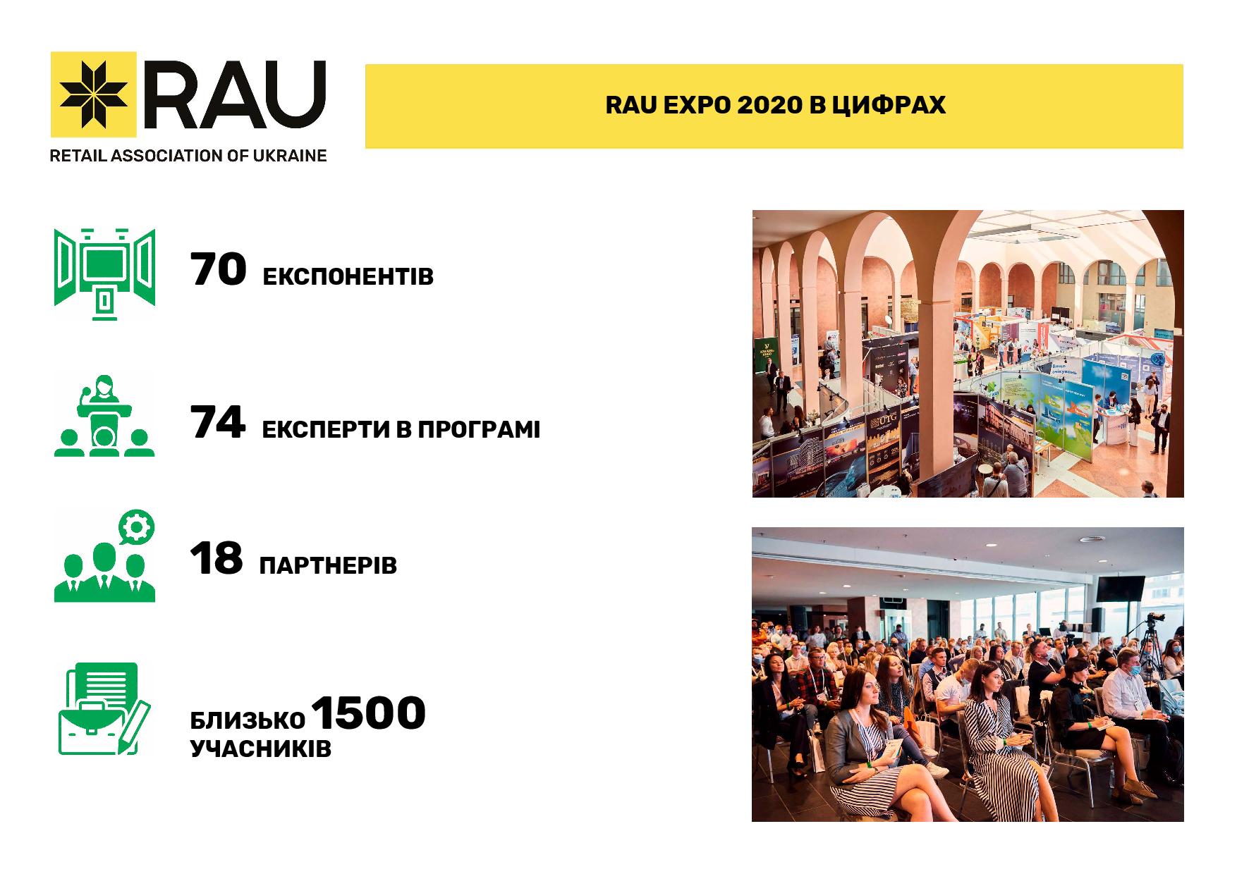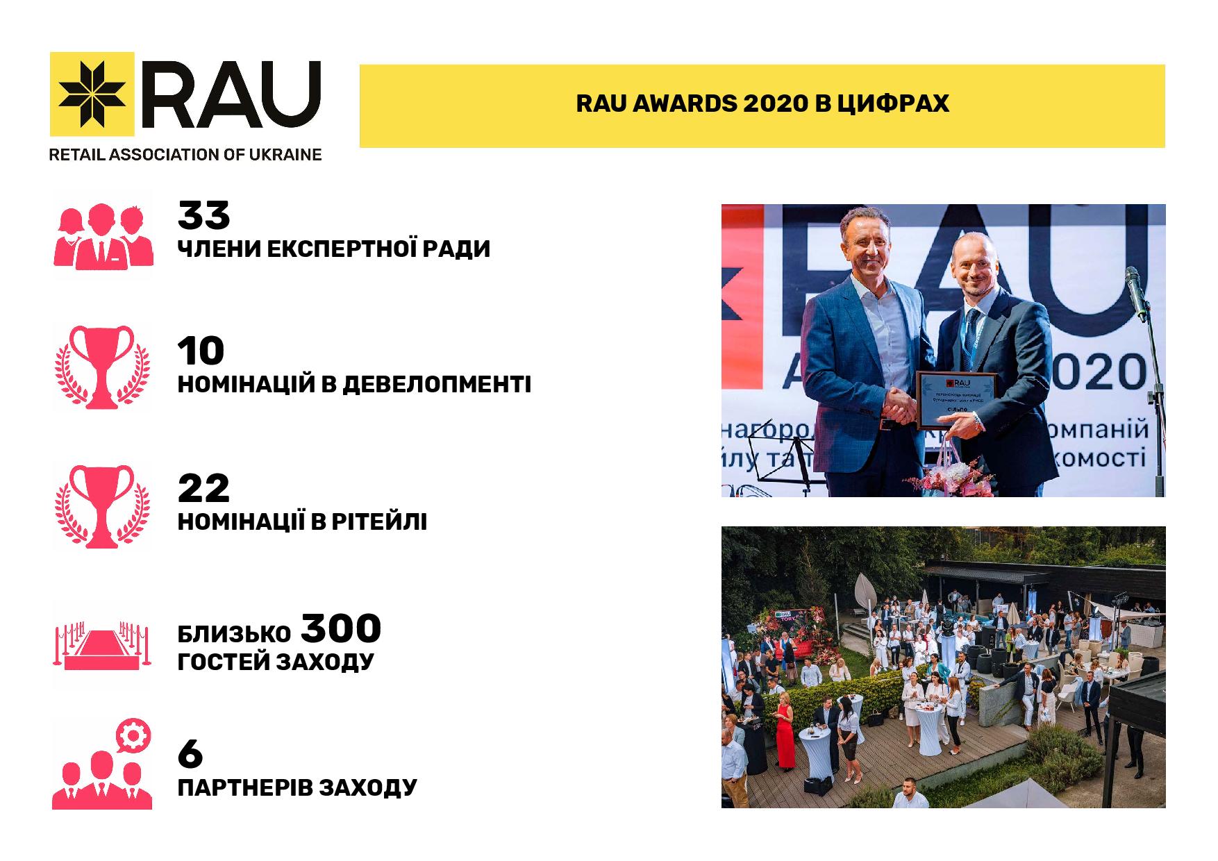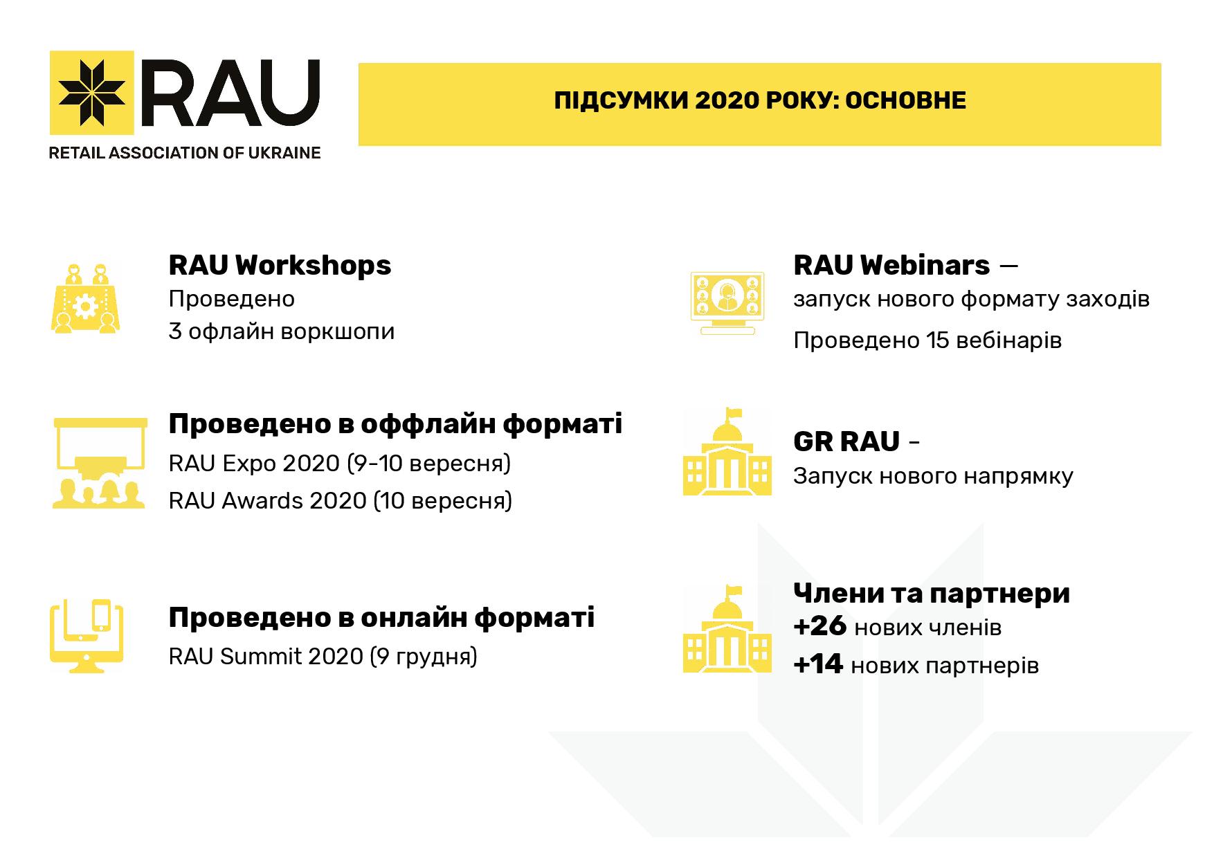 В целом за прошлый год Ассоциация ритейлеров Украины провела 15 RAU Webinars и 3 офлайн-воркшопа, а также три масштабных мероприятия сферы ритейла и девелопмента: церемонию награждения лучших компаний отрасли RAU Awards 2020, крупнейшую в Украине профильную выставку RAU Expo и традиционный итоговый RAU Summit (в формате онлайн ритейл-шоу).