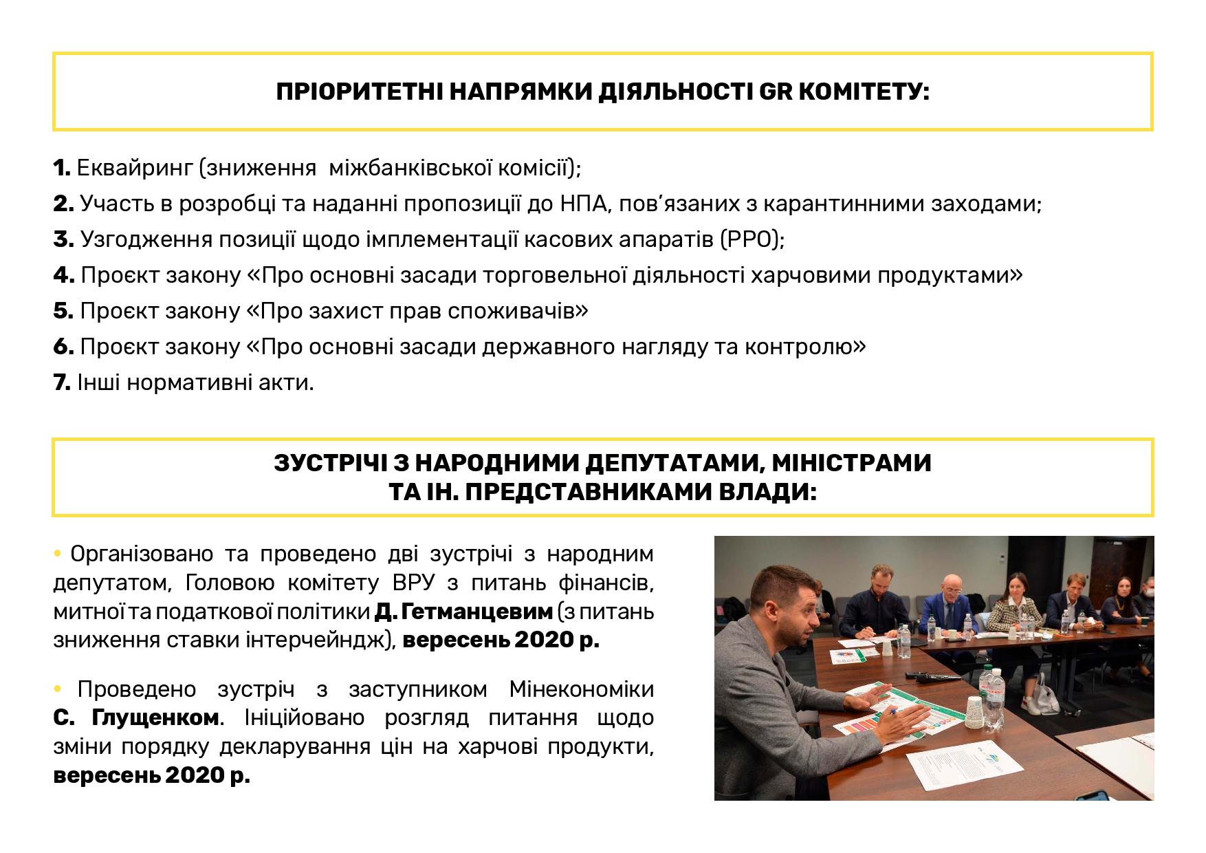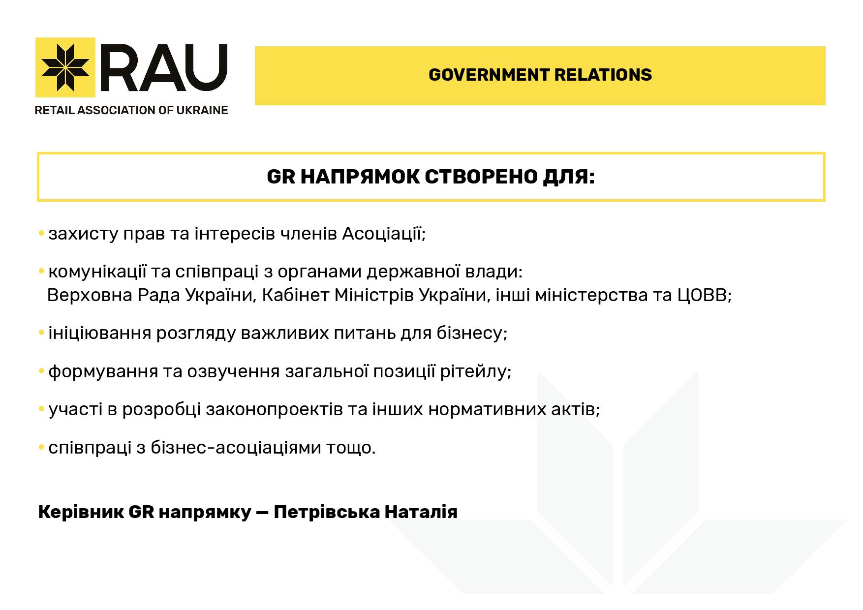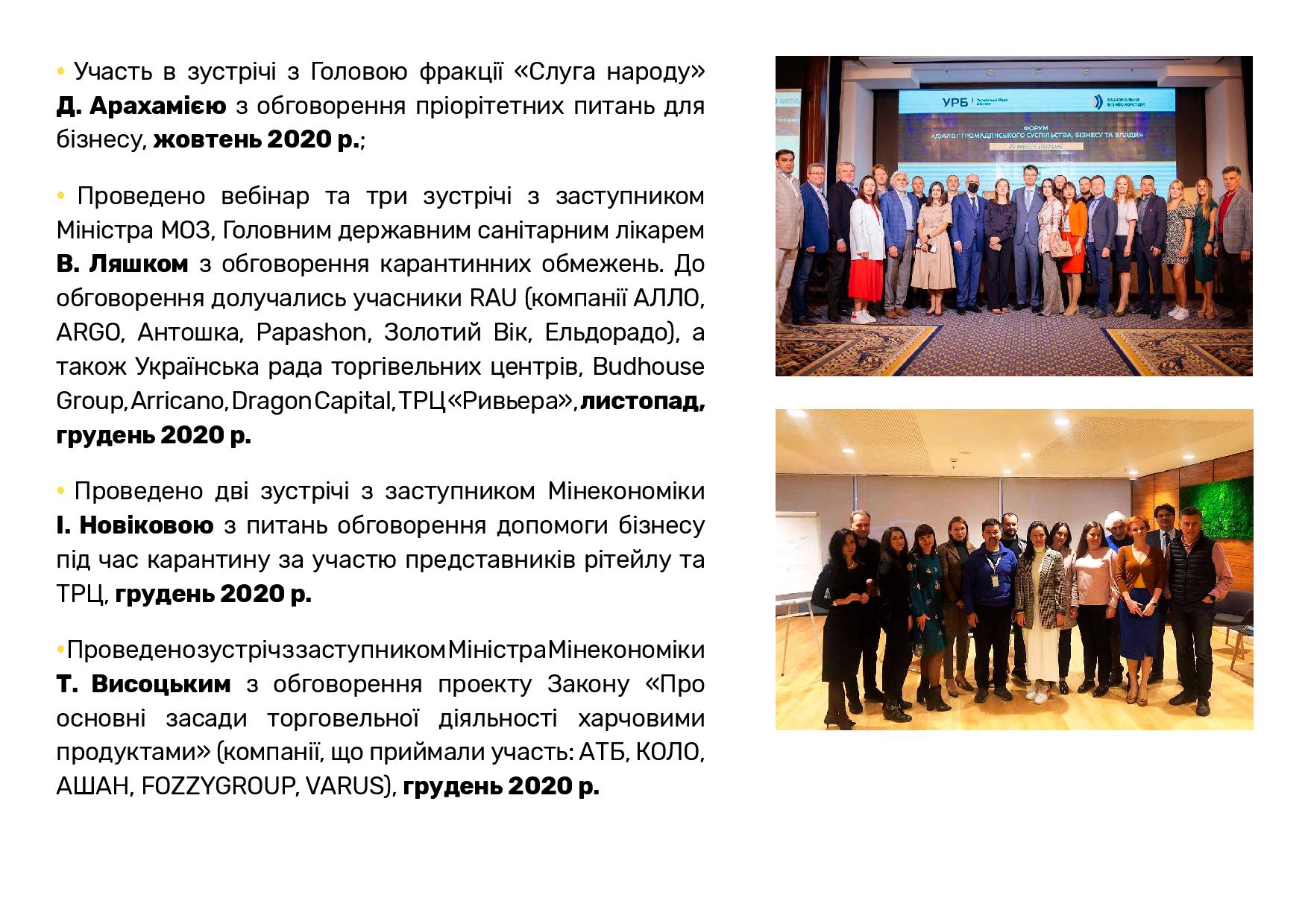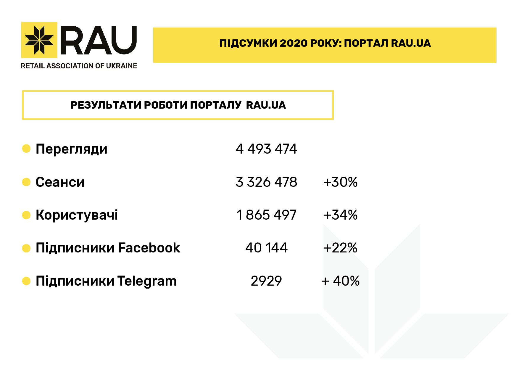 В целом за прошлый год Ассоциация ритейлеров Украины провела 15 RAU Webinars и 3 офлайн-воркшопа, а также три масштабных мероприятия сферы ритейла и девелопмента: церемонию награждения лучших компаний отрасли RAU Awards 2020, крупнейшую в Украине профильную выставку RAU Expo и традиционный итоговый RAU Summit (в формате онлайн ритейл-шоу).