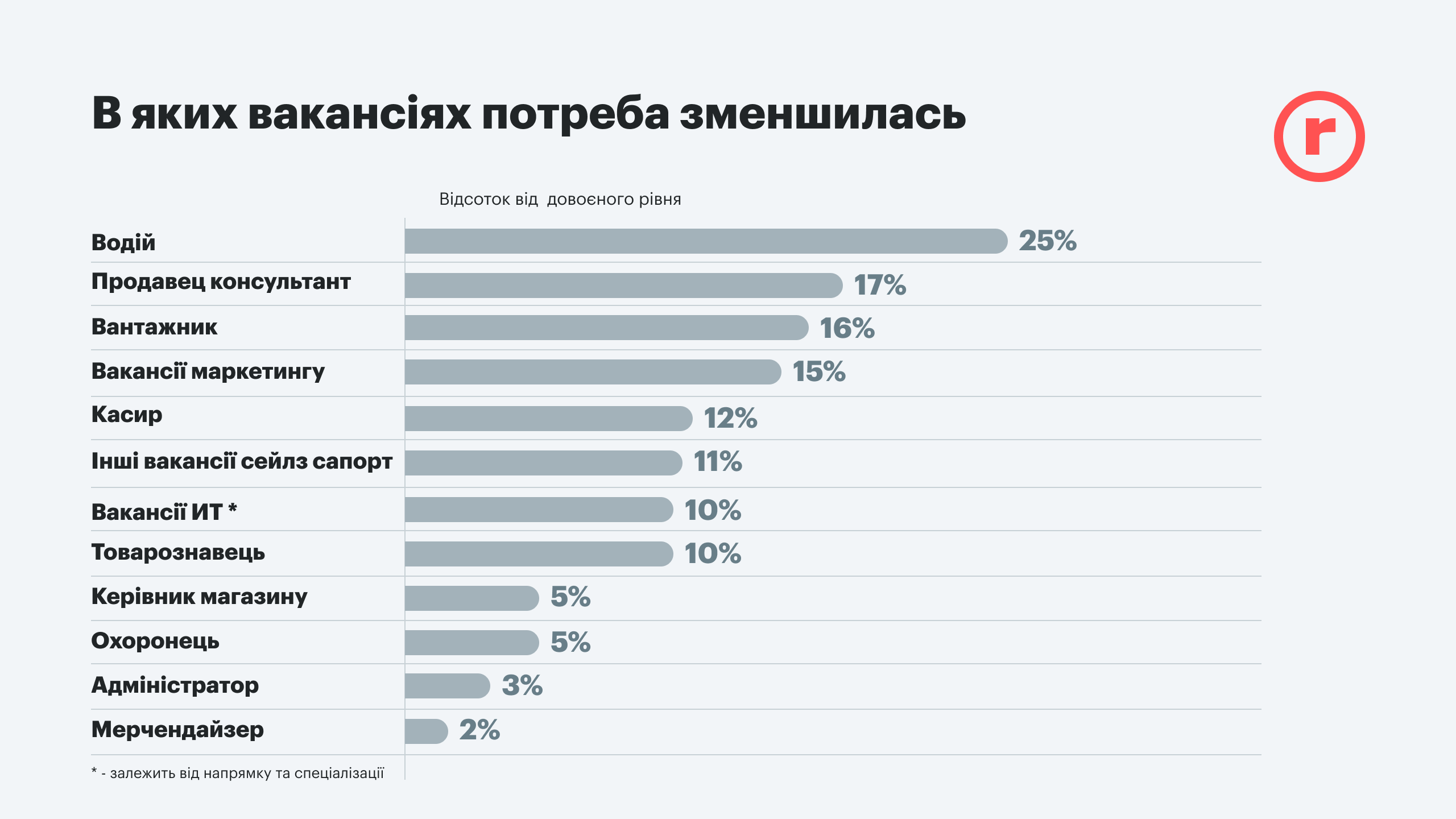Потребность в разных специалистах, обусловленная войной, лучше видна по таким категориям как водитель и продавец. Причем водителя найти тяжелее. Как видим, меньше всего вакансий сейчас для мерчендайзеров и администраторов: 2% и 3% соответственно.