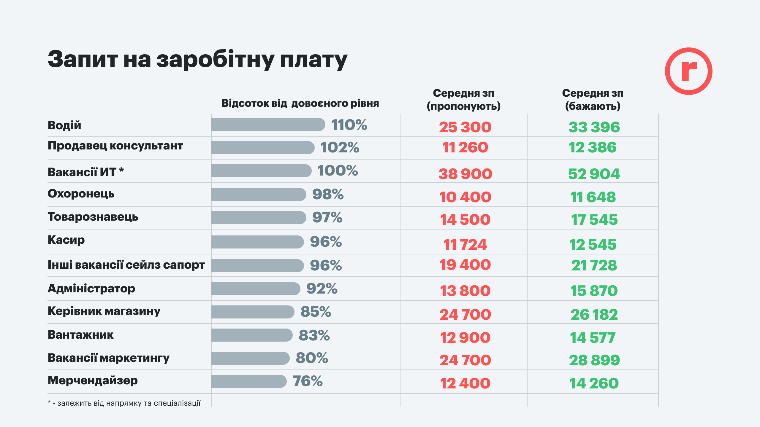 В то же время дефицит определенных кадров привел к повышению средних ставок оплаты труда, прежде всего водителям (на 10%) и продавцам (на 2%). Также некоторые IT-специалисты смогли сохранить свои заработки. Однако ожидания большинства кандидатов гораздо выше. Те же продавцы-консультанты хотят получать в среднем на 10% больше, чем им предлагают (12386 грн против 11260 грн), а водители хотят на треть больше. Большие аппетиты у специалистов в сфере современных информационных технологий, требующих увеличения оплаты на 36%.