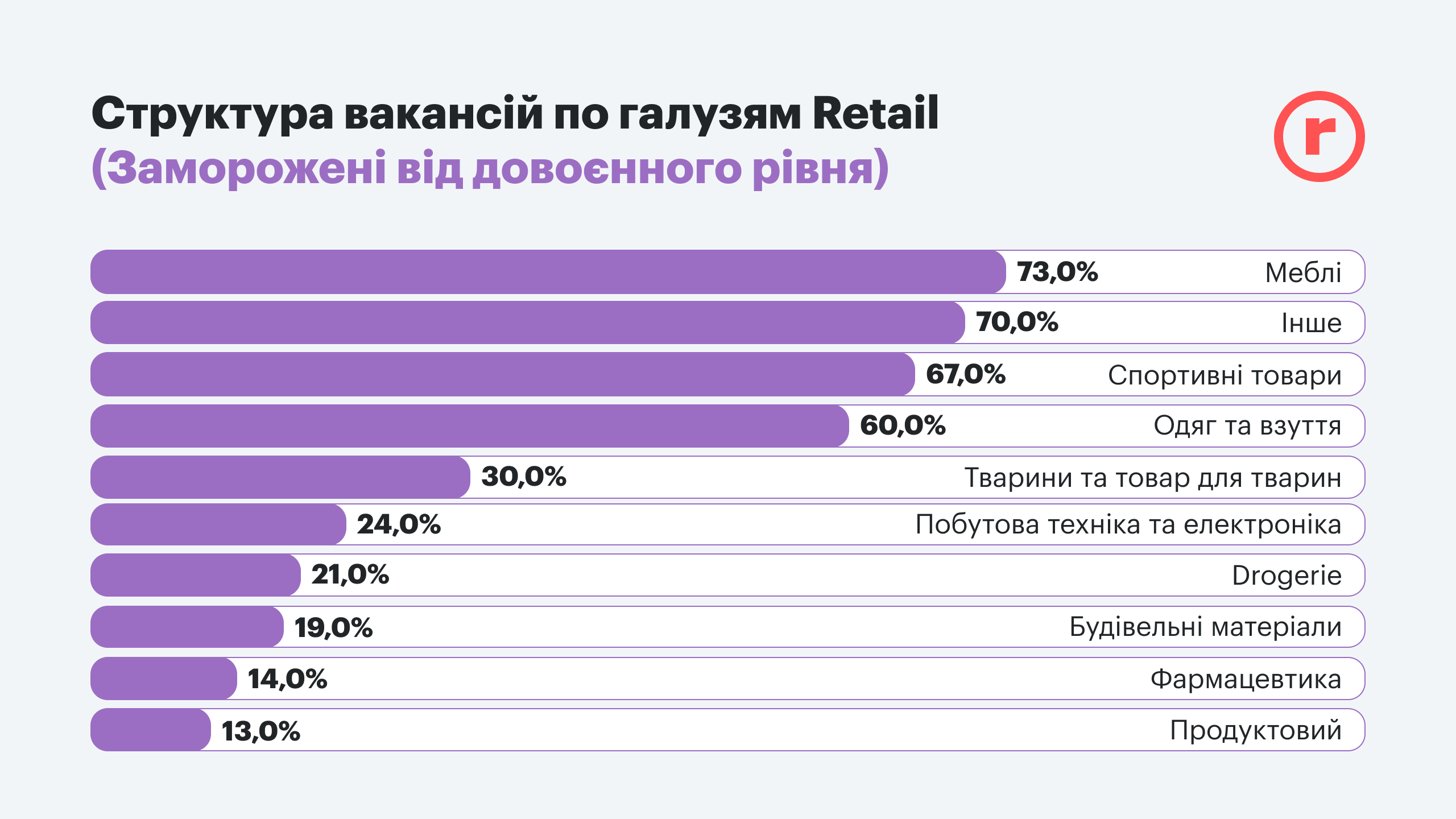 Если говорить о количестве открытых (новых) и актуальных позиций по сравнению с замороженными вакансиями, так же заметно, что менее всего “приостановлен” набор в торговле продуктами питания – заморожено лишь 13% от довоенного уровня вакансий. Также, соответственно спросу на самое необходимое, похожая ситуация сложилась в сфере торговли лекарствами (14%), drogerie (21%) и товаров для животных (30%).