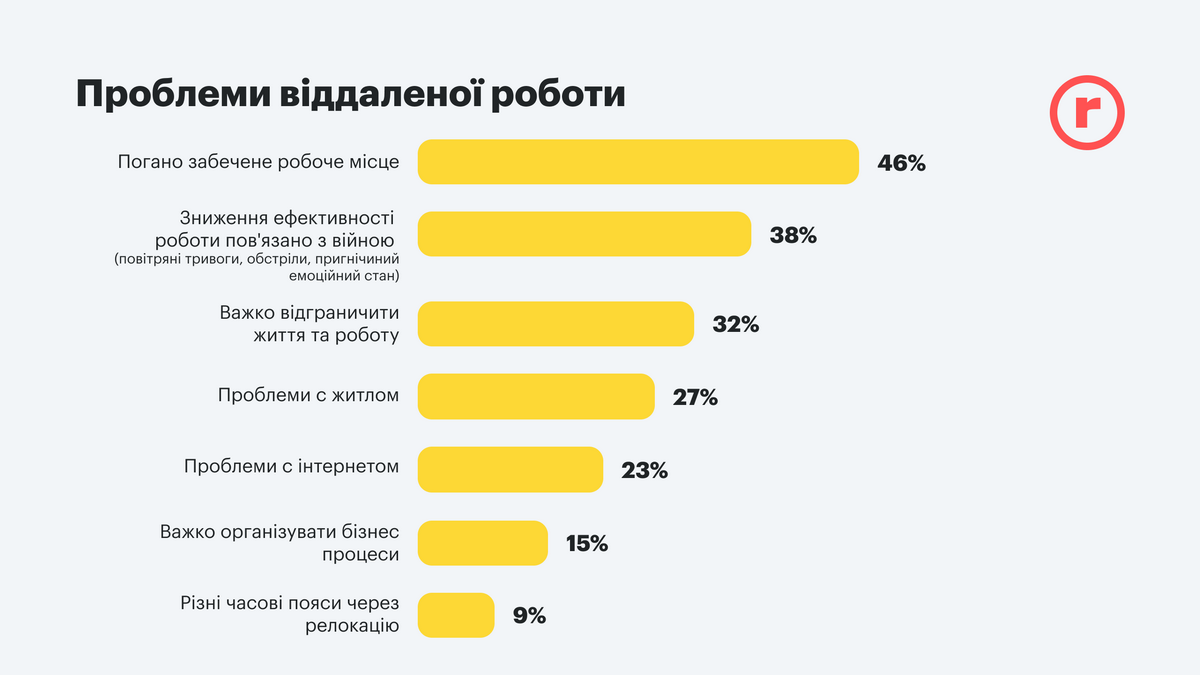 Среди проблем организации режима удаленной работы работники во главу угла ставят плохое обеспечение достойных условий труда – 46% опрошенных. На втором и третьем месте – проблемы снижения эффективности труда из-за войны войны и невозможность четко отделить работу от личной жизни. И только потом идут проблемы с поиском жилья и организацией бизнес-процессов.