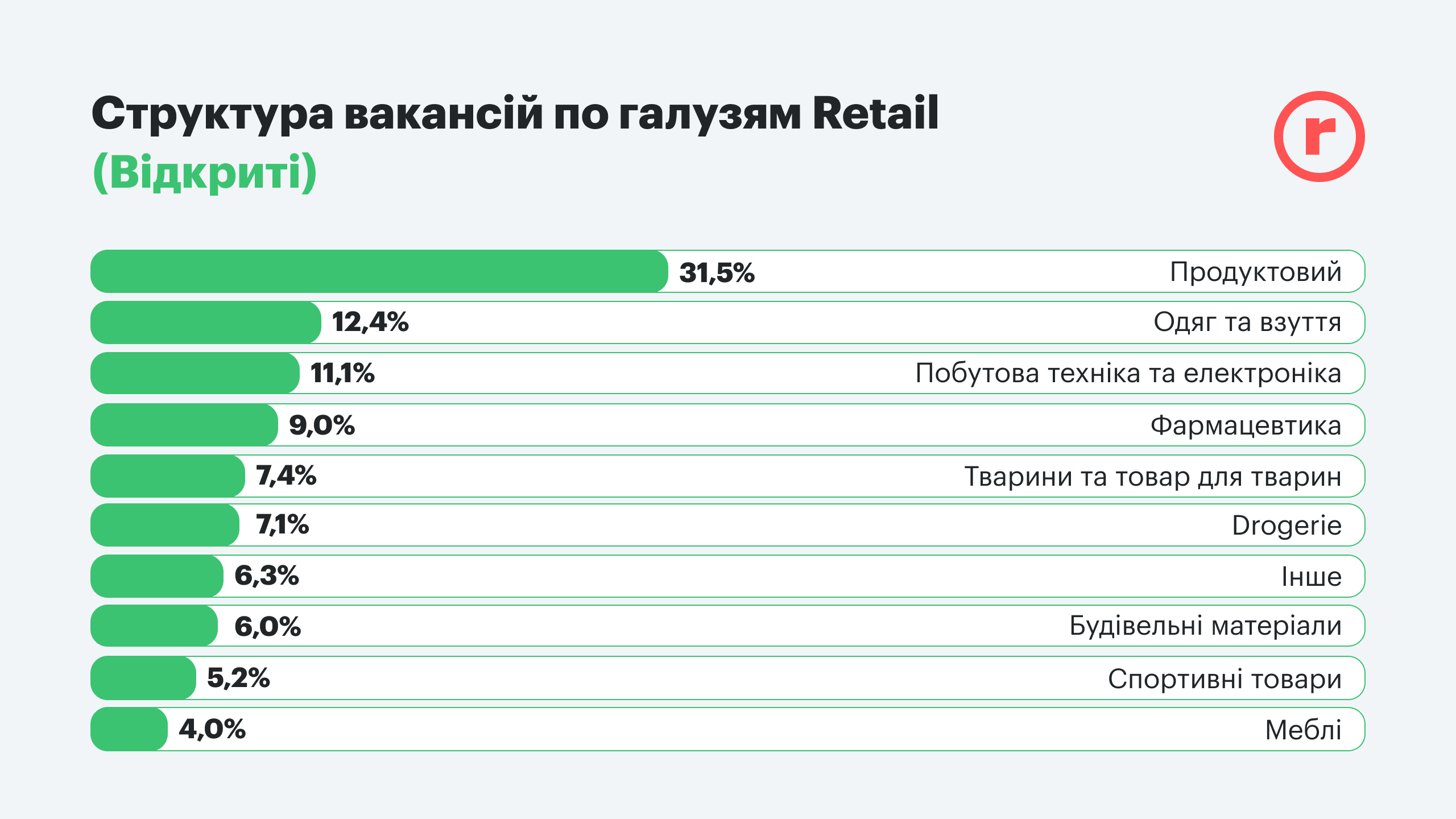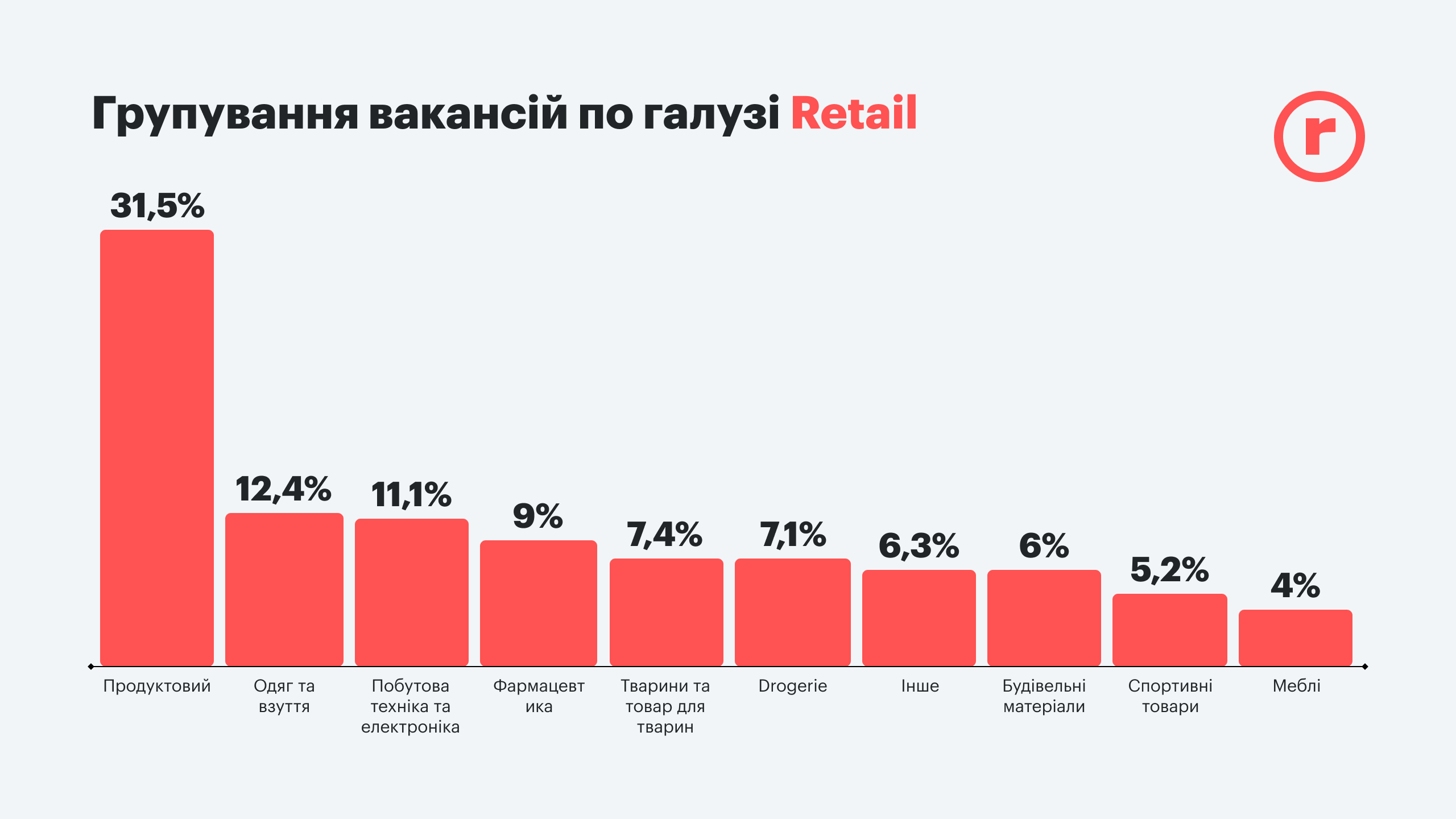 Розничная торговля не была исключением, но должна была реагировать быстрее, учитывая критическую важность направления, особенно в сфере снабжения товарами первой необходимости. Поэтому подавляющее большинство вакансий находится в продуктовом ритейле. Дефицит специалистов здесь ощущался всегда, а с учетом того, что в этом направлении торговли был задействован высокий процент женщин, мигрировавших в более безопасные районы, ситуация с подбором кадров стала более актуальной.