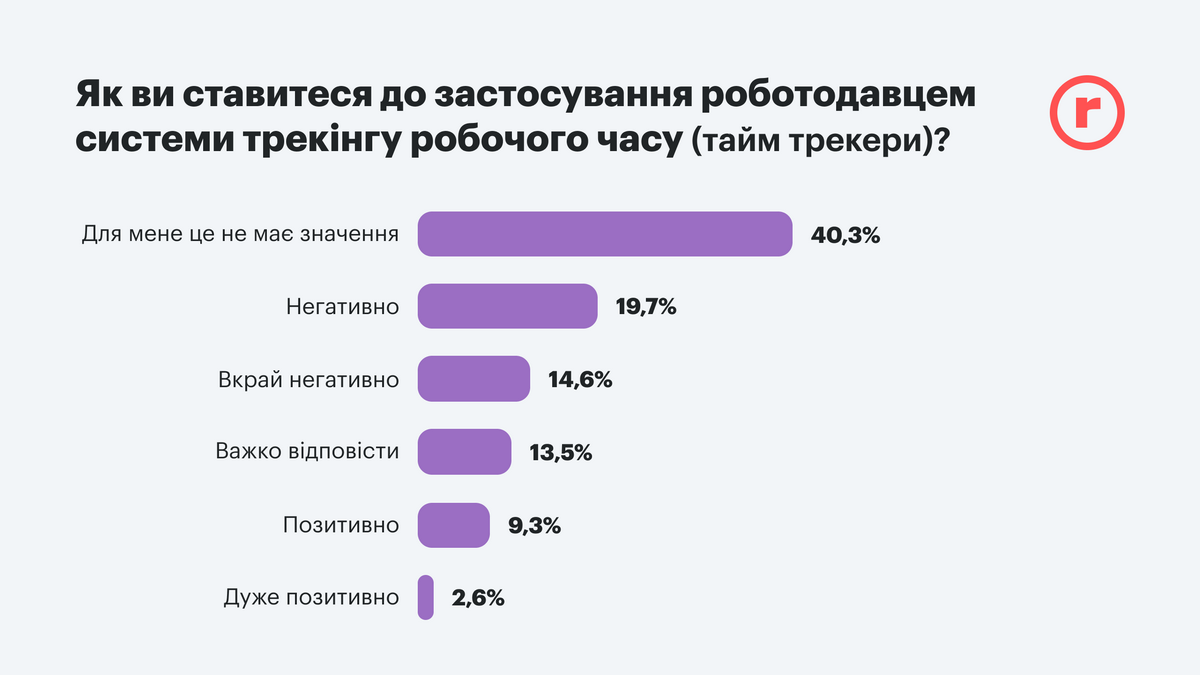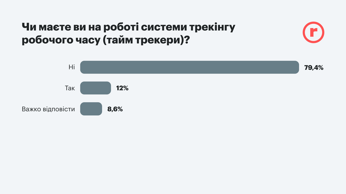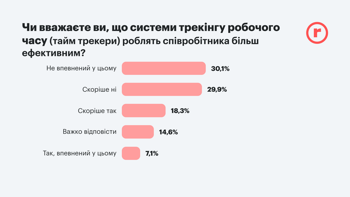 Интересно, что работодатели склонны доверять своим подчиненным и не часто используют систему трекинга рабочего времени. Таких всего 12%. Что положительно воспринимается только 12% работников, а 40% – безразлично. При этом 60% людей сомневаются в эффективности такого метода контроля.