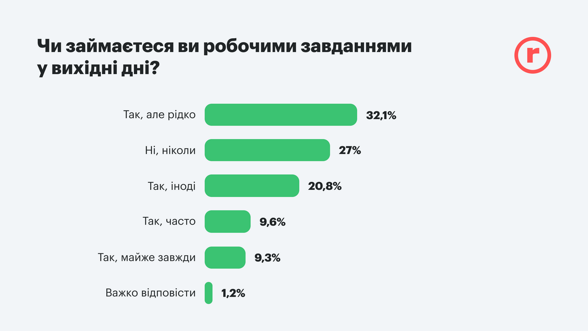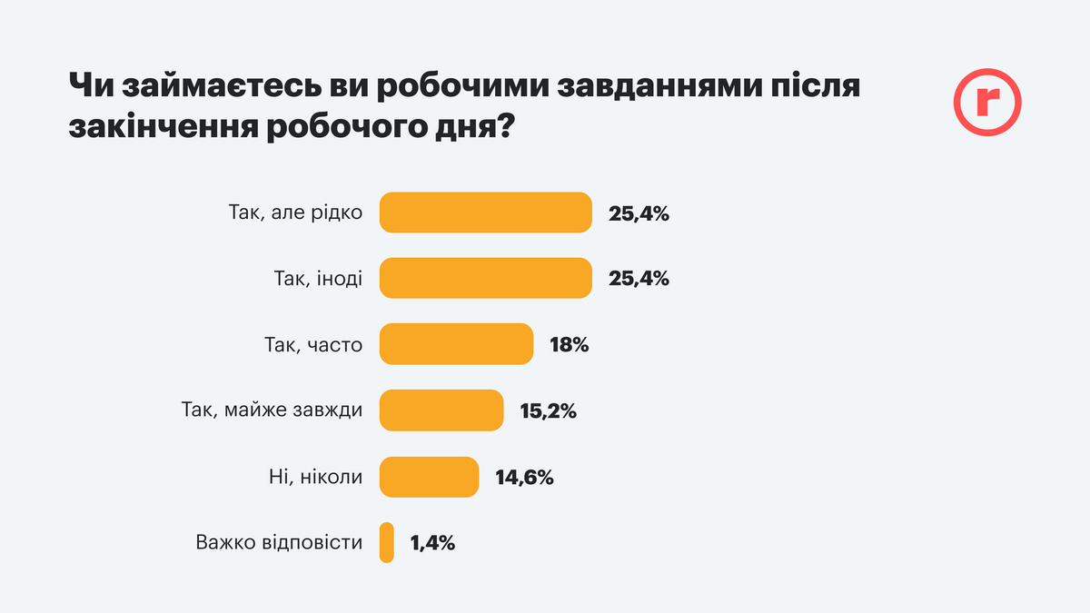 Как показывает исследование, большинство работников успевает сделать свое дело в рабочее время и лишь иногда им приходится работать сверхурочно. Только 15% почти постоянно остаются после работы и 9,3% работают в свой выходной. Приблизительно столько же людей делают это довольно часто.