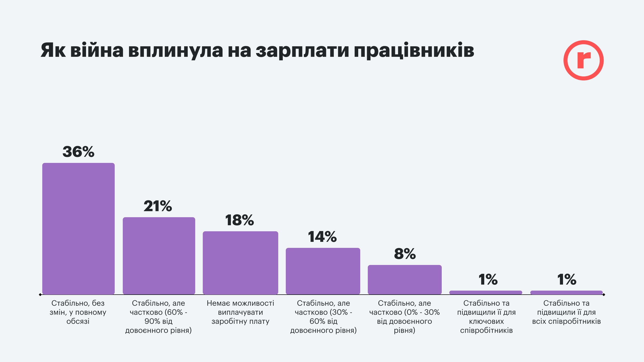 Война оказала влияние и на зарплаты работников. Так, сохранить довоенные оклады и стабильность выплат смогли лишь 36% ритейлеров. Еще пятая часть работодателей смогла сохранить оклады на уровне 60-90% от довоенного уровня. Только 2% смогли повысить зарплату всем сотрудникам или хотя бы ключевым специалистам. Все остальные вынуждены были значительно сократить фонд оплаты труда.