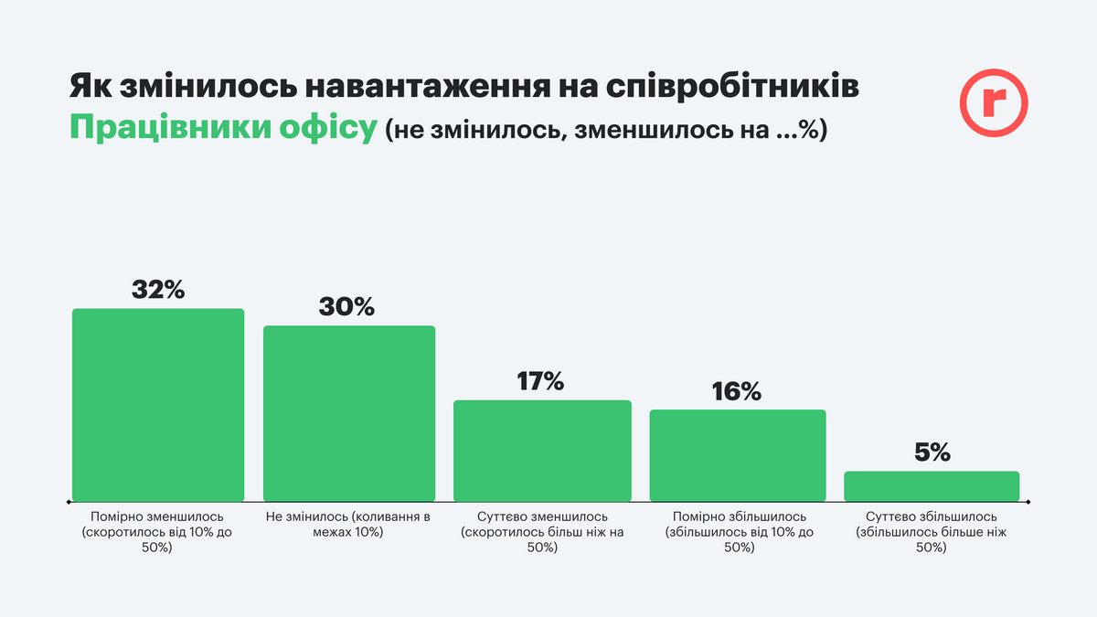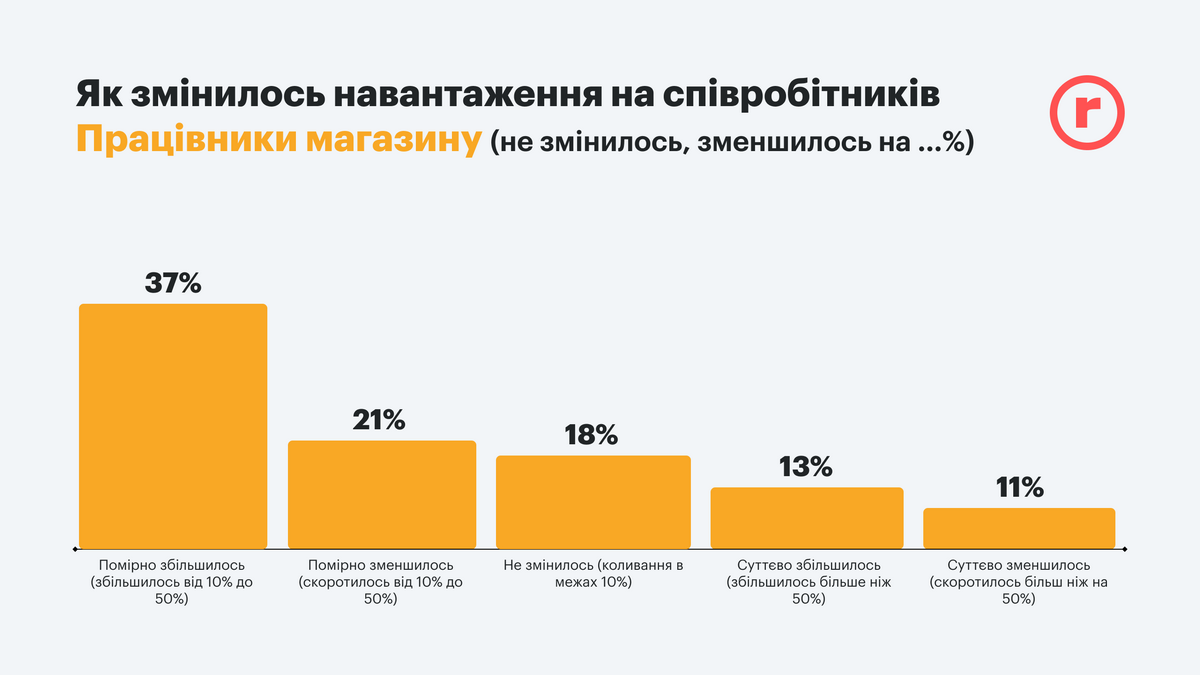 Сокращение и оптимизация ритейла во время войны не сильно повлияли на рабочие нагрузки. Интересно, что 37% работников магазинов почувствовали умеренное увеличение количества работы (от 10% до 50%) и сопоставимое количество офисных работников – 32% – почувствовали такое же облегчение. Подобным может похвастаться только 21% магазинного штата. При этом треть офисных работников делают свое дело в довоенных объемах и только 5% стали работать гораздо больше. Хотя и в магазинах увеличение погрузки вдвое касается 13%.