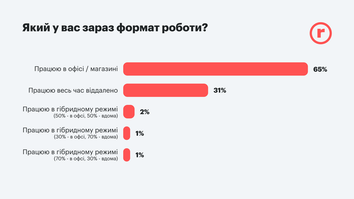 К сожалению, ритейл, такая область, где нельзя всех сотрудников перевести в удаленный режим. Кто-то должен обслуживать покупателей, принимать товар и тому подобное. Поэтому подавляющее большинство работает на месте, таких 65%. И только треть персонала может себе позволить выполнять работу удаленно. Тех, кто работает по гибридной схеме не более 4%.