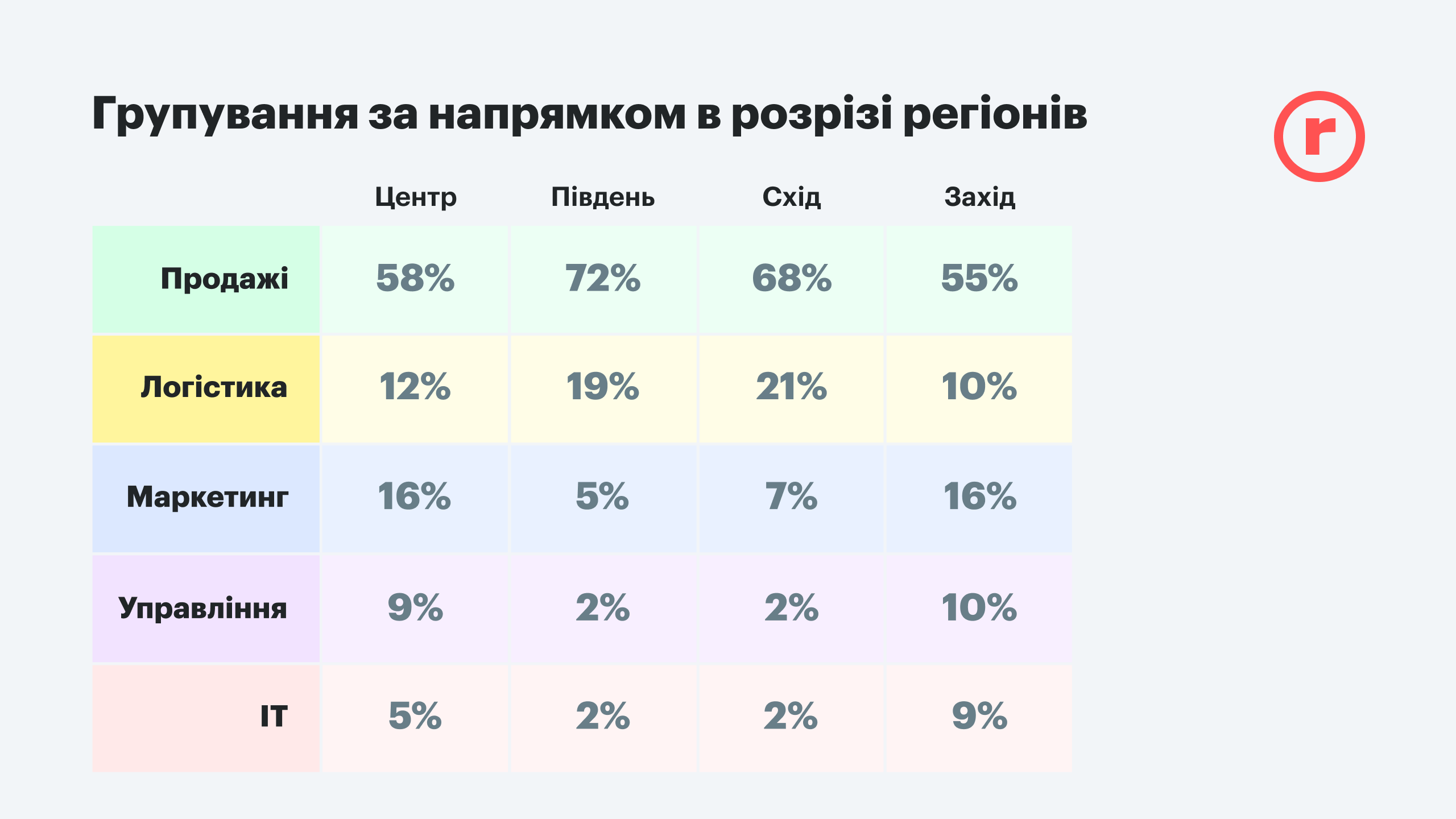 Если же проанализировать разные направления работы всех видов ритейла, то группировка вакансий по направлениям в разрезе регионов выглядит тоже довольно интересно. Так, больше всего вакансий в сфере продаж фиксируется на юге и востоке страны (72% и 68% соответственно). В общем, как видим, больше половины вакансий по всей Украине – это продажи. Так же на юге и востоке самая большая потребность в специалистах по логистике – примерно пятая часть всех вакансий в регионе. На западе страны и в центре, где цепочки поставок более стабильны, потребность в логистах вдвое меньше. Здесь лучше искать работу специалистам по маркетингу и управлению.