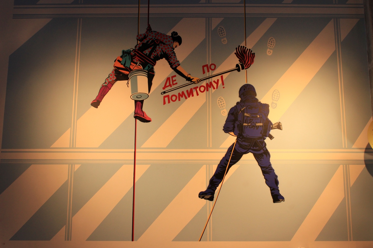Интерьер Реберни наполнили разными занятными деталями. На стенах можно увидеть произведения на остросоциальные темы известных художников Андрея Ермоленко и Ярослава Боднара. Люстру создали из изоляторов Львовского изоляторного завода.