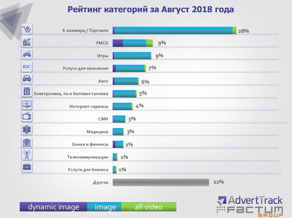 Factum Group представила аналитический отчет по рынку интернет-рекламы Украины в августе 2018 года. По данным компании, наиболее активными рекламодателями в онлайне в августе оставались представители сферы ритейла и e-commerce, доля которых в общем объеме составила 28%.