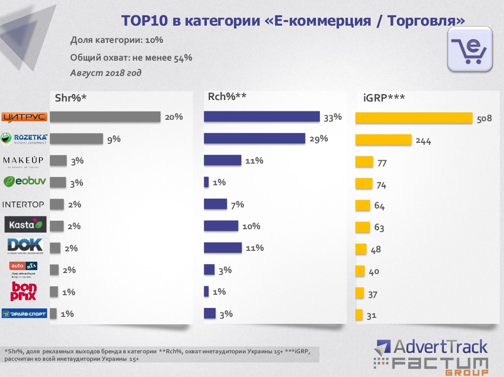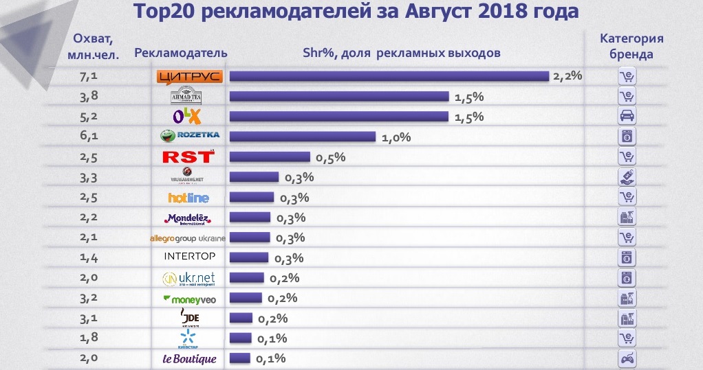 В топ-20 крупнейших рекламодателей в интернете по количеству рекламных проявлений в августе вошли торговые сети Цитрус и Intertop, а также интернет-магазины Rozetka и Le Boutique.