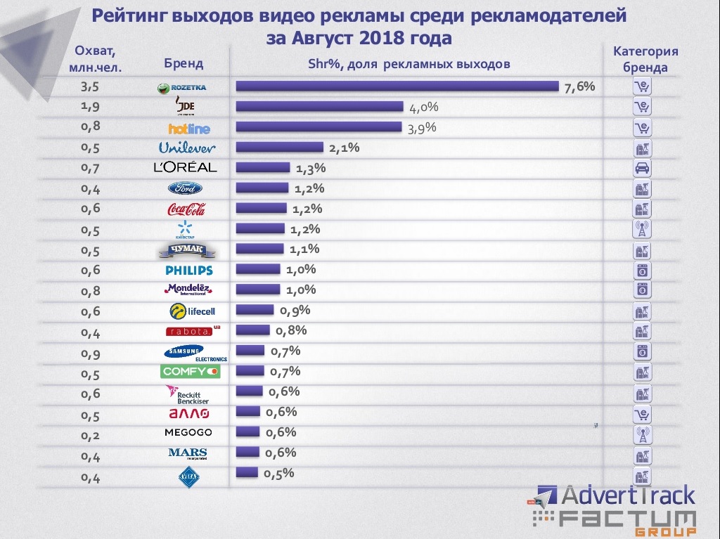Любопытно, что по доле выходов видеорекламы безусловным лидером августа стал интернет-супермаркет Rozetka с показателем 7,6%. В топ-20 крупнейших также вошли крупные сети техники и электроники Comfy и Алло.