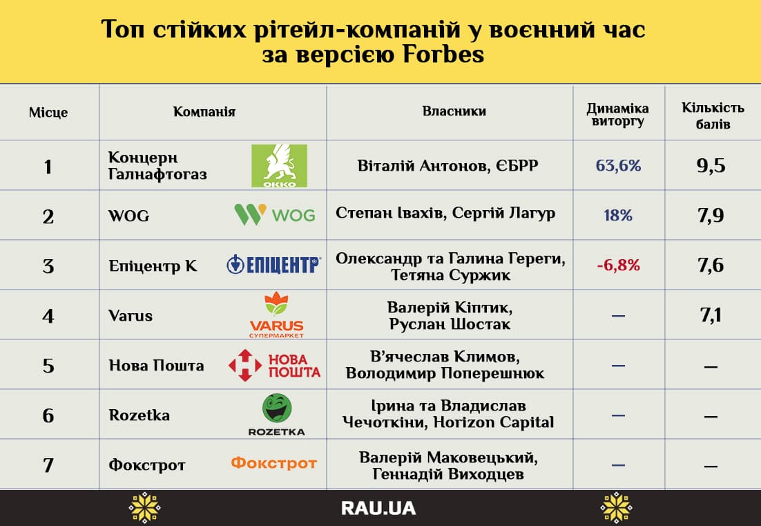 Вместо ежегодного рейтинга “100 крупнейших частных компаний Украины” в этом году Forbes Украина определил компании, которые оказались устойчивее других, смогли сохранить, а порой и приумножить бизнес в военный год. RAU выбрала из них компании, связанные с розничной торговлей.