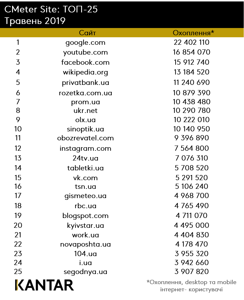 Интернет-магазины в топ-25 популярных сайтов в Украине за май 2019