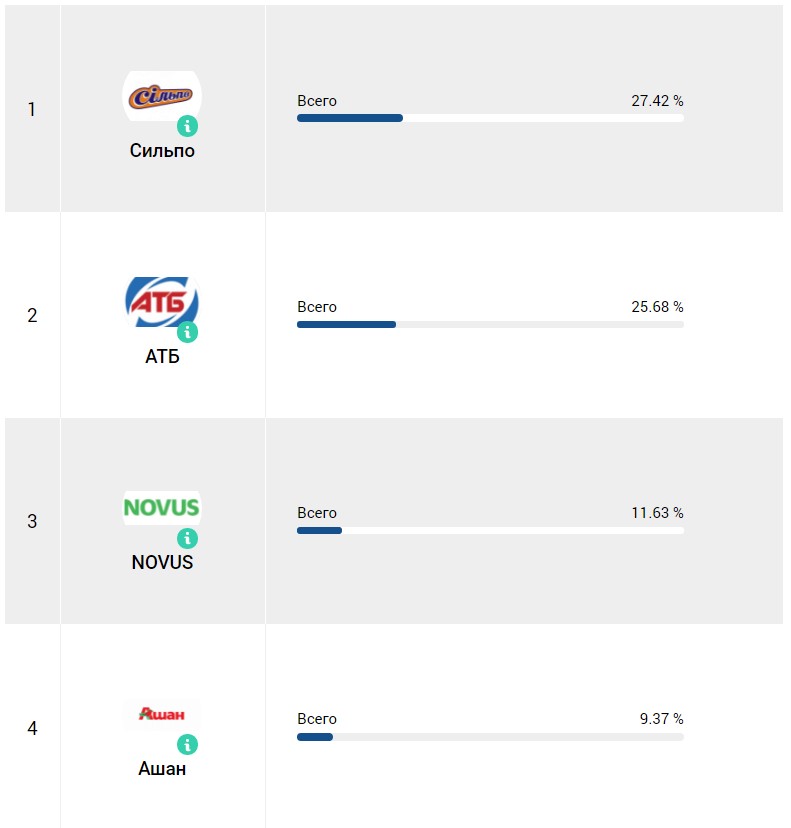 По результатам опроса, 27,42% проголосовавших предпочли сеть магазинов сельпо. Второе место, с небольшим отрывом и общим количеством 25,68% голосов, – занял АТБ. На двоих ритейлеры получили более 50% всех голосов потребителей. Третье место досталось сети супермаркетов Novus, которая смогли получить 11,63% потребительских предпочтений от проголосовавших.